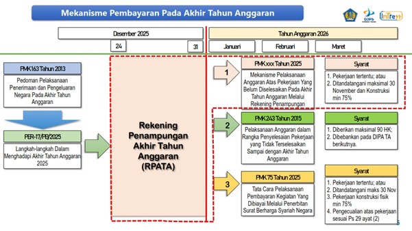 Untuk menjaga konsistensi prinsip bahwa pembayaran atas beban APBN hanya dilakukan setelah barang atau jasa diterima, sekaligus mendukung optimalisasi dan efektivitas pelaksanaan anggaran yang belum dapat diselesaikan pada akhir tahun anggaran, pemerintah menerapkan mekanisme Rekening Penampungan Akhir Tahun Anggaran (RPATA). RPATA berfungsi sebagai sarana penampungan dana sementara atas pekerjaan yang masih berproses hingga melewati tanggal 31 Desember, tanpa mengabaikan prinsip kehati-hatian dan akuntabilitas dalam pengelolaan keuangan negara. Mekanisme ini merupakan penyempurnaan dari tata cara pembayaran akhir tahun sebelumnya yang mengandalkan bank garansi, yang dalam praktiknya masih mengandung risiko terhadap keamanan kas negara.