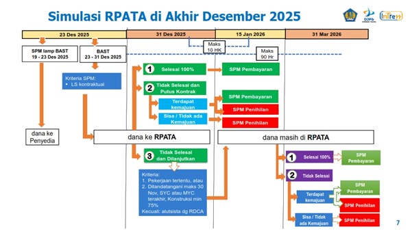 - Terhadap pekerjaan yang tidak terselesaikan di tanggal 31 Desember 2025 namun dilanjutkan penyelesaiannya ke TA berikutnya paling lama 90 hari kalender, maka prestasi yang telah dicapai s.d. tanggal 31 Desember 2025 belum dapat diajukan pembayaran terlebih dahulu. Pembayaran atas pekerjaan tersebut, dilakukan secara sekaligus pada saat batas pemberian kesempatan penyelesaian pekerjaan telah berakhir]