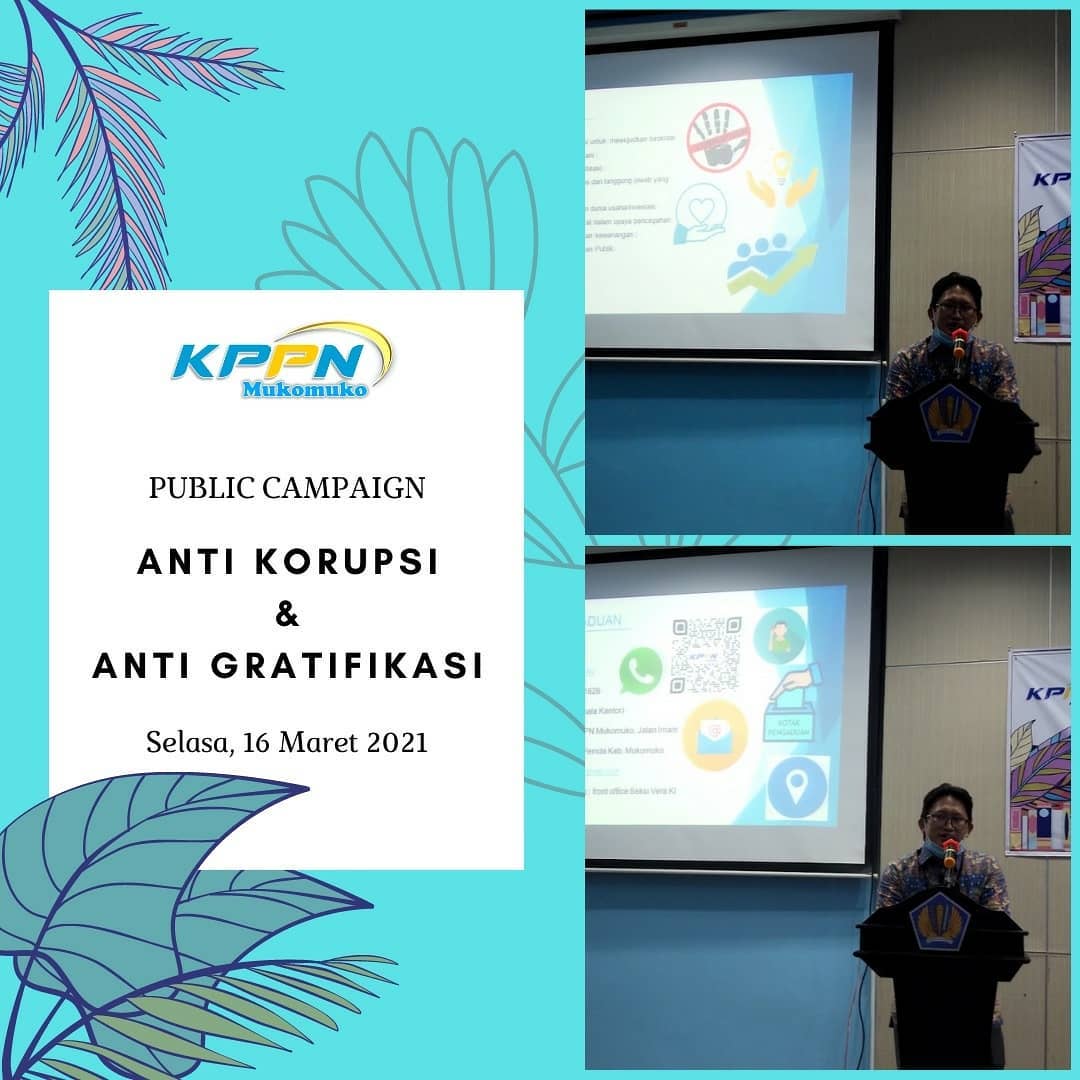 Pada hari Selasa tanggal 16 Maret 2021 Kepala KPPN Mukomuko melakukan public campaign anti korupsi dan anti gratifikasi kepada para satuan kerja mitra KPPN Mukomuko yang hadir pada kegiatan Sosialisasi Capaian Output, Perhitungan IKPA, Revisi DIPA 2021 dan SAKTI WEB full modul di Aula KPPN Mukomuko.
