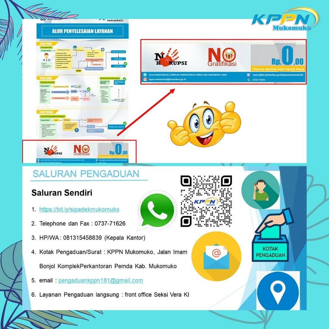 Salah satu saluran pengaduan internal KPPN Mukomuko adalah https://bit.ly/sipadekmukomuko yang merupakan inovasi KPPN Mukomuko di bidang layanan pengaduan oleh stakeholder. Beliau juga mengajak seluruh satker untuk bersama-sama menjaga integritas dan komitmen anti korupsi dan anti gratifikasi.