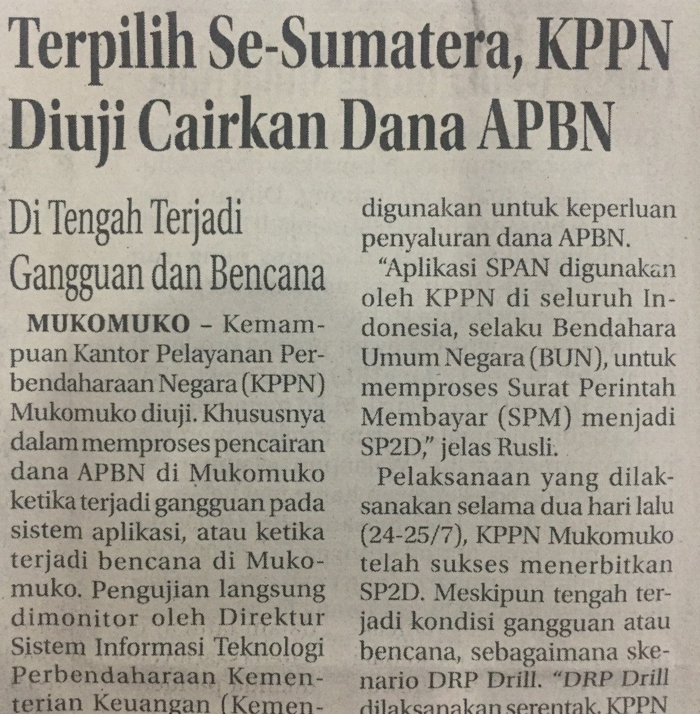 “DRP Drill dilaksanakan serentak, KPPN Mukomuko bersama 6 KPPN lainnya. KPPN Mukomuko menjadi satu-satunya KPPN di wilayah Sumatera yang ditunjuk oleh Kantor Pusat Direktorat Jenderal Perbendaharaan Kemenkeu sebagai peserta DRP Drill Aplikasi SPAN,” kata Rusli.