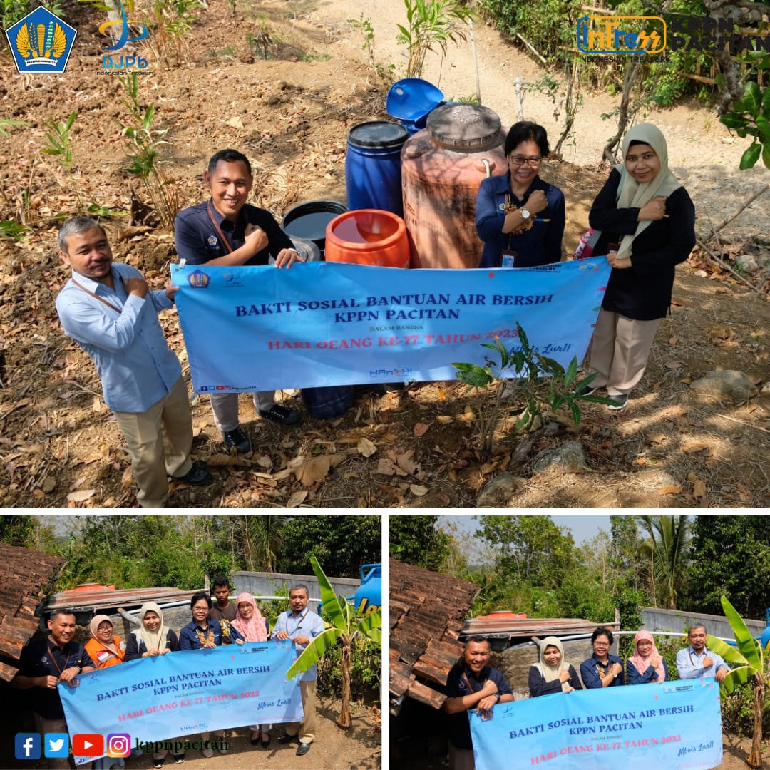 Dalam rangka memperingati Hari Oeang ke-77, KPPN Pacitan melaksanakan kegiatan bakti sosial berupa pemberian bantuan air bersih ke daerah yang terdampak kekurangan air bersih akibatnya musim kemarau di wilayah Kab. Pacitan. Bekerja sama dengan LMI Cab. Pacitan, kegiatan dilaksanakan pada hari Kamis, 12 Oktober 2023 di Dusun Jaten dan Dusun Kenteng (2 lokasi), Desa Donorojo, Kec, Donorojo, Kab, Pacitan. Kemenkeu Satu, Kemenkeu Tepercaya !!!