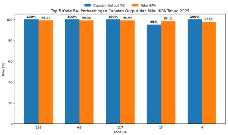 Berdasarkan data Indikator Pelaksanaan Anggaran Januari 2026 (posisi akhir Tahun Anggaran 2025), terdapat lima Kode BA yang menunjukkan kinerja menonjol dengan capaian output dan nilai IKPA yang tinggi. Grafik yang ditampilkan memperlihatkan bahwa mayoritas Kode BA tersebut mencatat capaian output mendekati atau mencapai 100 persen, sejalan dengan nilai IKPA yang berada pada kisaran sangat baik. Secara rata-rata, Kode BA 116, 66, 117, 15, dan 4 menjadi contoh bahwa konsistensi dalam pengisian capaian output dan pengelolaan kinerja anggaran mampu menghasilkan nilai IKPA yang optimal. Temuan ini sekaligus menegaskan bahwa kualitas pengisian capaian output bukan sekadar aspek administratif, melainkan faktor strategis dalam penilaian kinerja pelaksanaan anggaran. Hal ini dikarenakan nilai capaian output menjadi penyumbang tertinggi nilai kinerja pelaksanaan anggaran yaitu sebesar 25% paling tinggi dari 6 indikator lain.