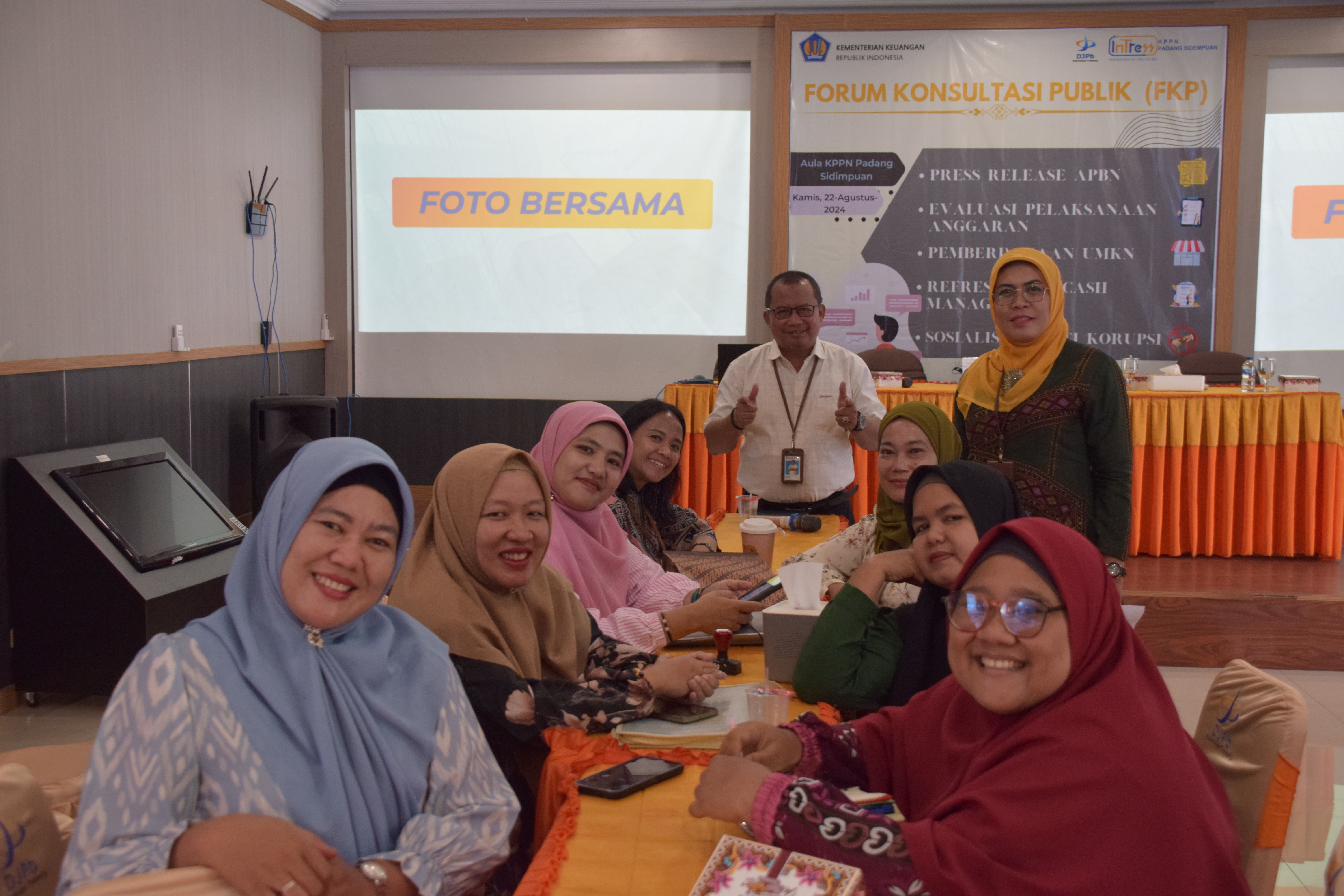 KPPN Padang Sidempuan menyelenggarakan Forum Konsultasi Publik (FKP) pada Hari Kamis, 22 Agustus 2024 bertempat di Aula KPPN Padang Sidempuan. Kegiatan tersebut disertai dengan Press Release APBN sd Bulan Juli 2024, Evaluasi Pelaksanaan Anggaran, Pemberdayaan UMKM, Refreshment Cash Management, dan Sosialisasi Anti Korupsi. Kegiatan dihadiri oleh perwakilan Stakeholders Pengguna Layanan, Perangkat Pemerintah Daerah Kota Padang Sidempuan, Pelaku UMKM/Pelaku Bisnis Mitra Digipay Lingkup KPPN Padang Sidempuan, Akademisi UIN SYAHADA, Lembaga Swadaya Masyarakat Lingkup Kota Padang Sidempuan, dan Perwakilan Perbankan Kota Padang Sidempuan. Kegiatan dibuka oleh MC, Ismaini Fitri. Sebelum melaksanakan kegiatan, para hadirin menyanyikan lagu Indonesia Raya, diikuti dengan Mars Kemenkeu, dan setelah itu berdoa bersama yang dipimpin oleh pelaksana Seksi Bank, Agus Sedayu. Acara dilanjutkan dengan sambutan Kepala KPPN dengan menyapa para audiens yang hadir dalam kegiatan dimaksud.