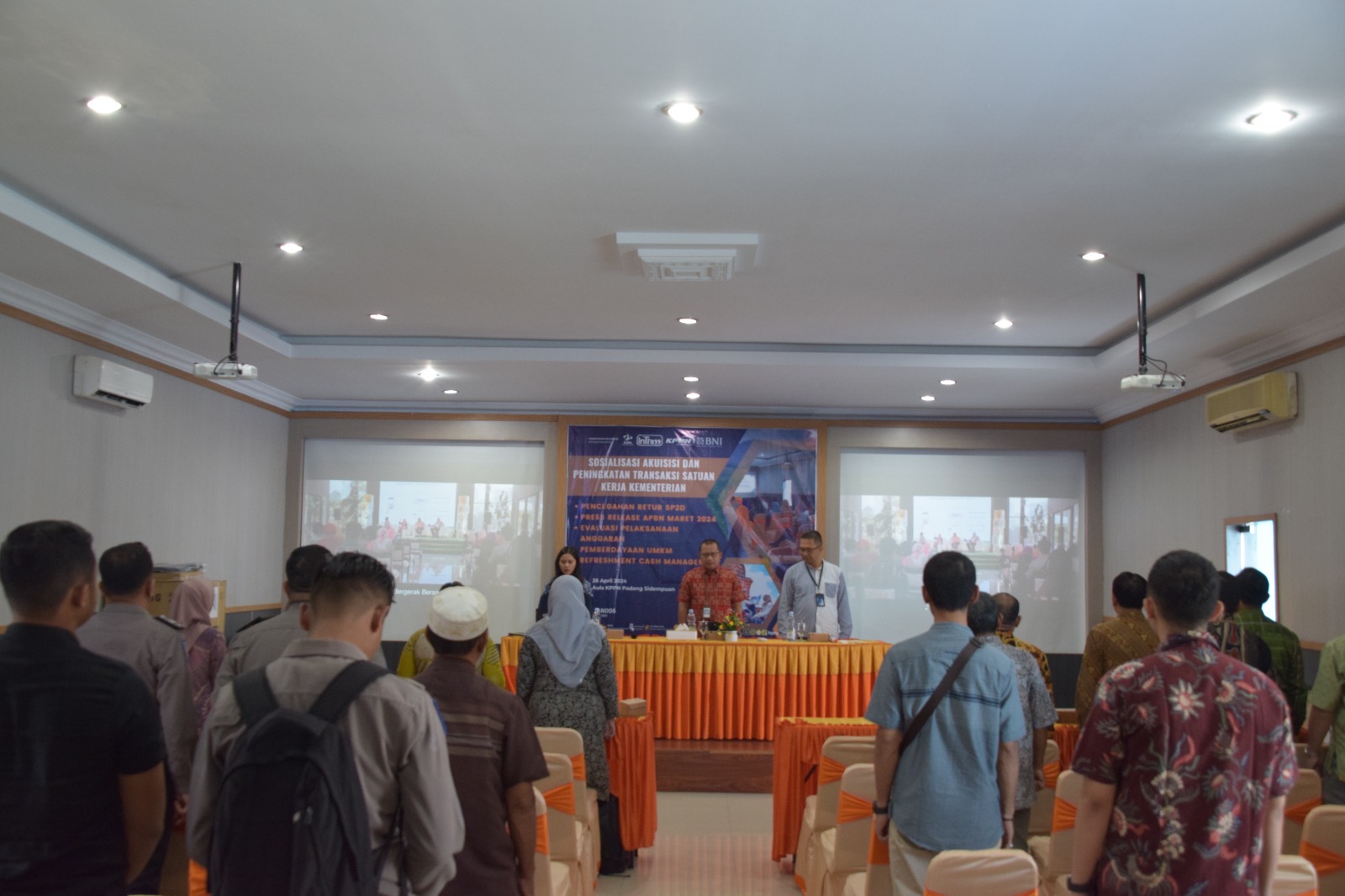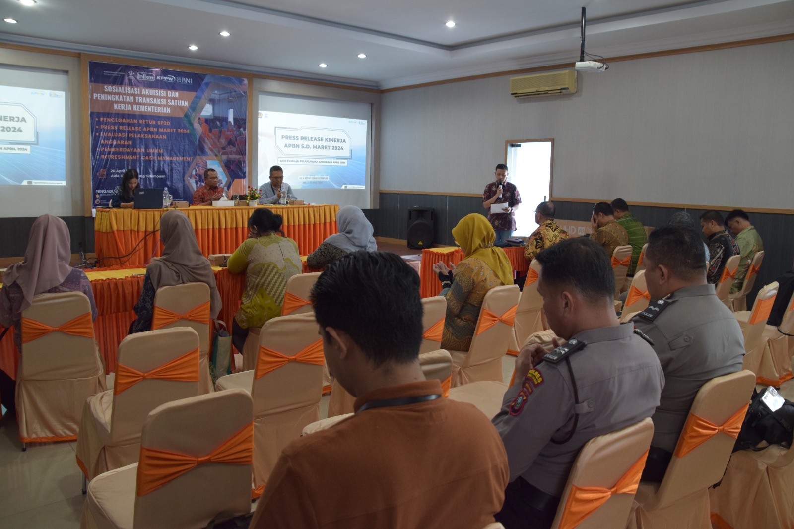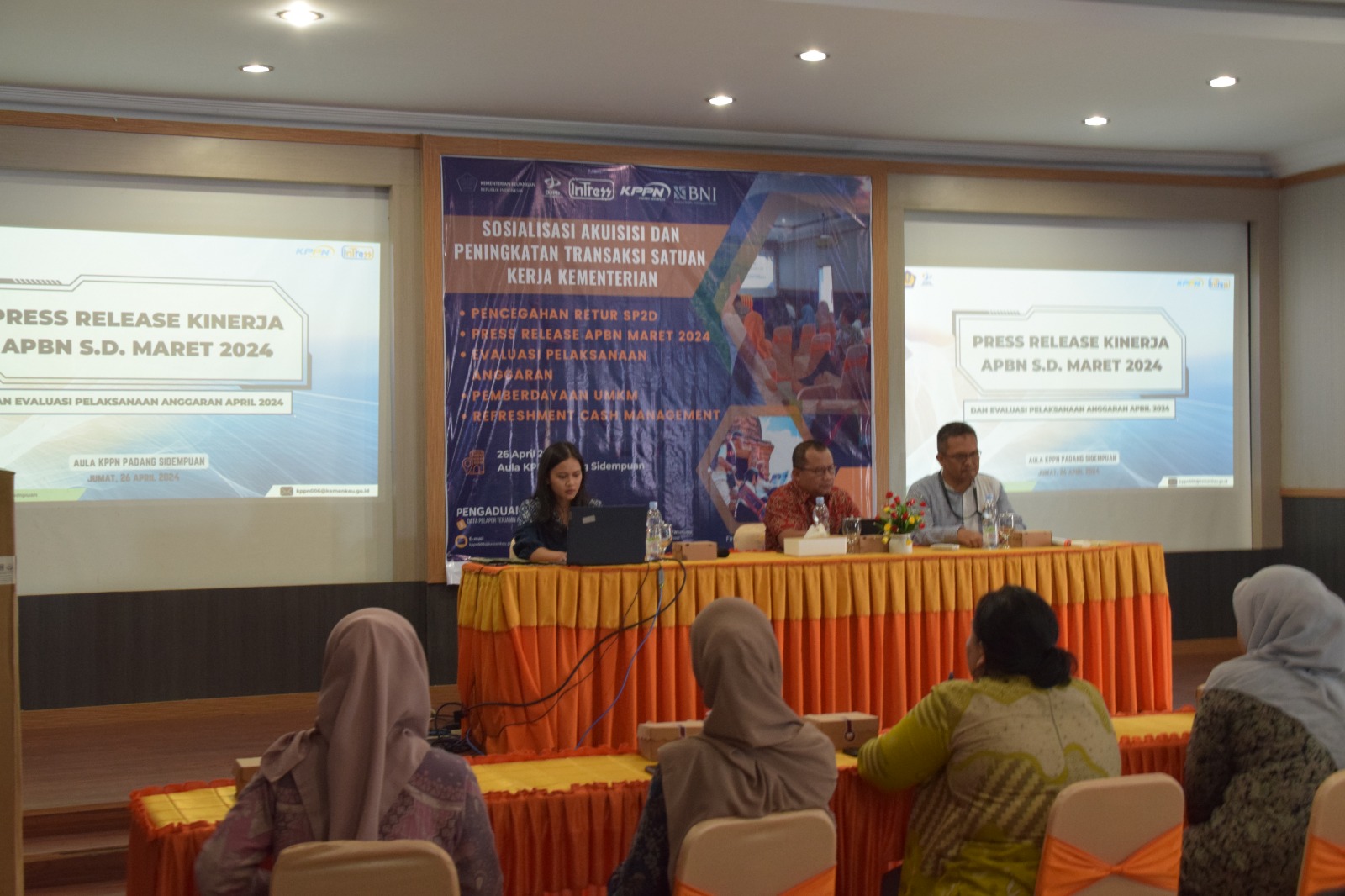 Indonesian Treasury (Intress) KPPN Padang Sidempuan telah melaksanakan Kegiatan Sosialisasi Akuisisi dan Peningkatan Transaksi Satuan Kerja Kementerian, Pencegahan Retur SP2D, Press Release APBN, Evaluasi Pelaksanaan Anggaran dan Pemberdayaan UMKM pada hari Jumat, 26 April 2024 pukul 09.00 s.d 12.00 WIB di Aula KPPN Padang Sidempuan. Kegiatan ini dihadiri oleh pegawai KPPN Padang Sidempuan, Bank Negara Indonesia (BNI) dan Satuan Kerja. Kegiatan ini dibuka oleh MC Ibu Ismaini Fitri dan dilanjutkan dengan pembacaan doa oleh Bapak M. Arif. Selanjutnya, kegiatan dilanjutkan dengan sambutan oleh Kepala KPPN Padang Sidempuan, Bapak IENG.