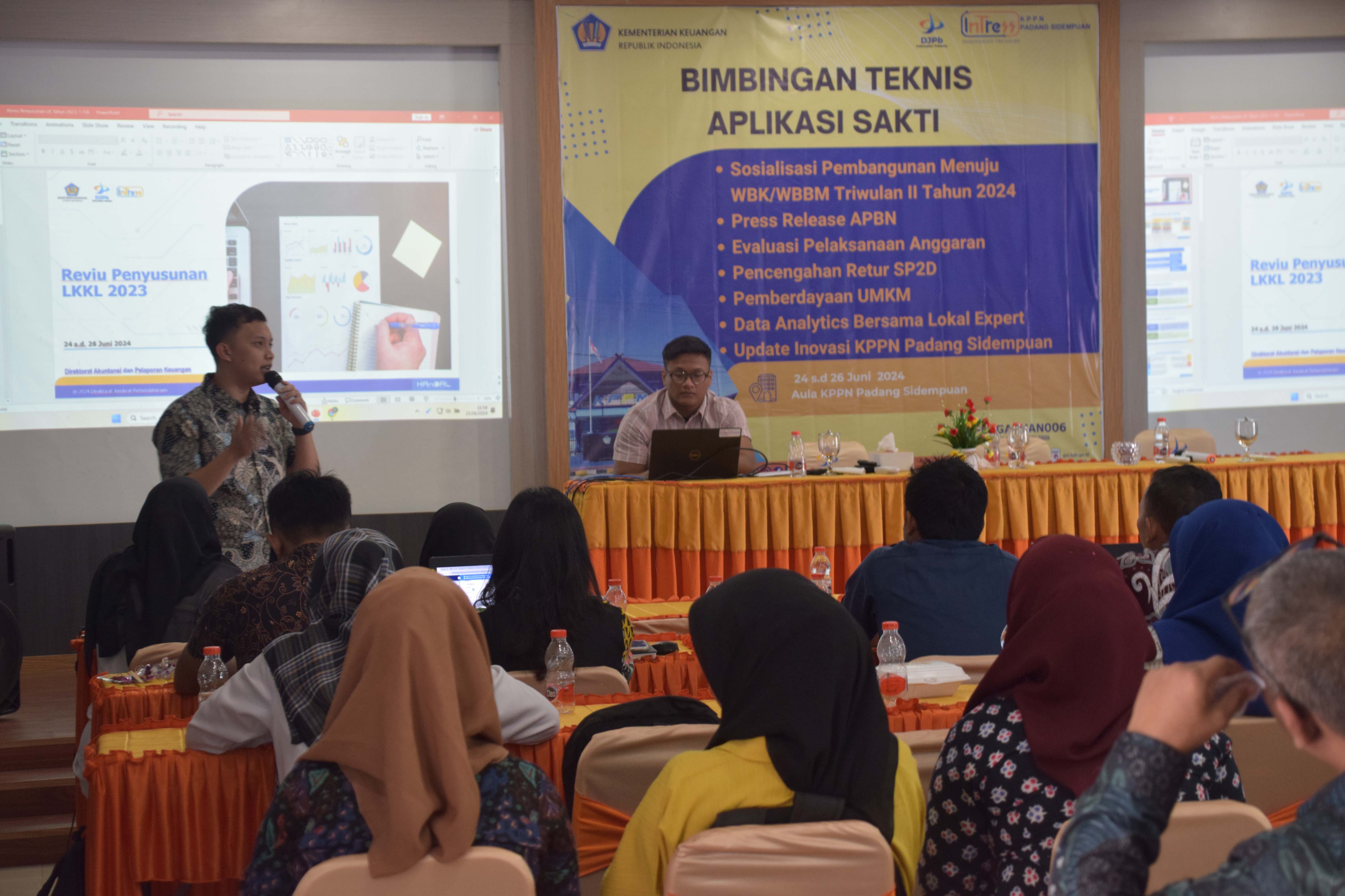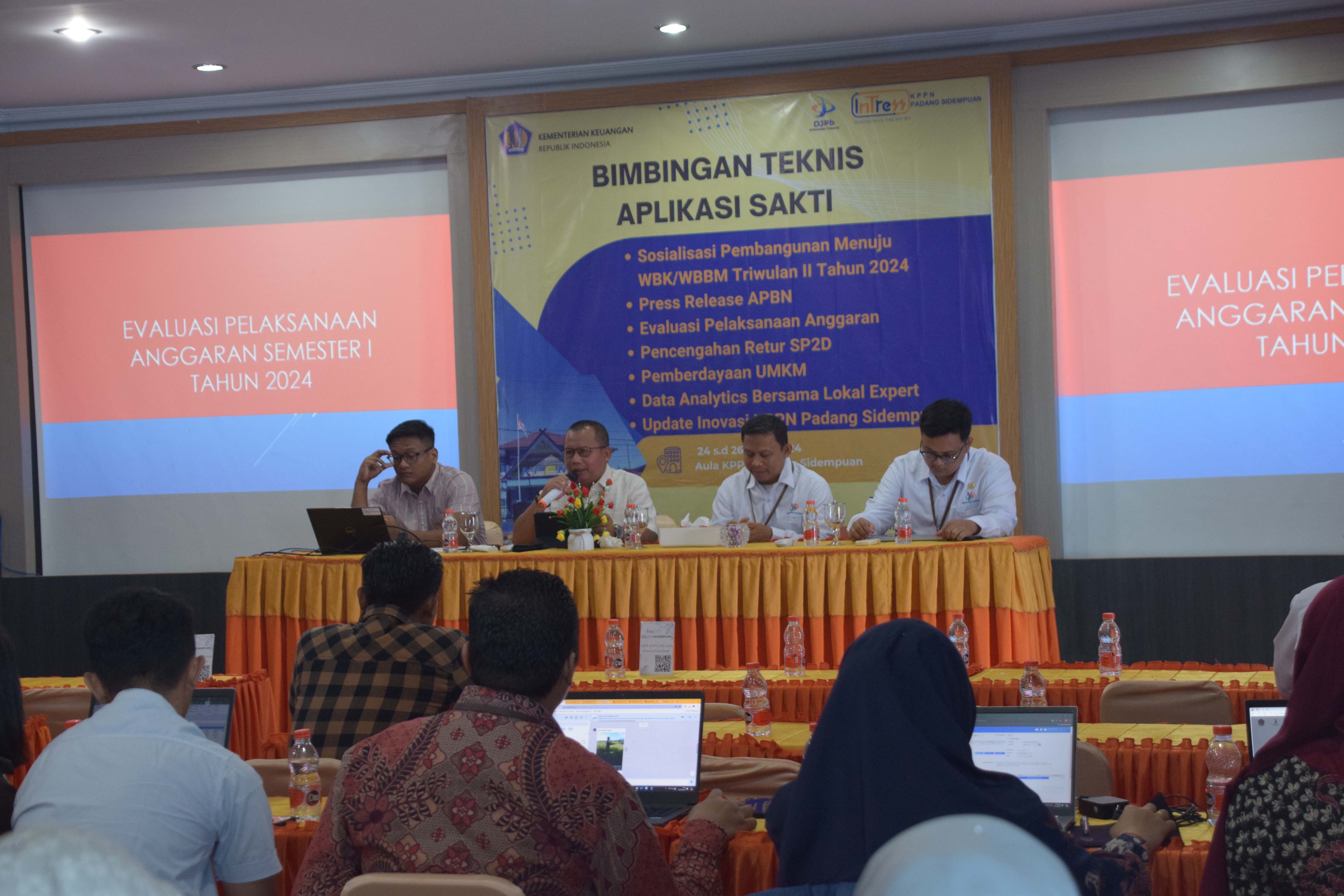Indonesian Treasury (InTress) KPPN Padang Sidempuan telah menyelenggarakan Kegiatan Bimbingan Teknis Aplikasi SAKTI, Sosialisasi Pembangunan ZI Menuju WBK/WBBM Triwulan II 2024, Press Release APBN, Evaluasi Pelaksanaan Anggaran (EPA), Pencegahan Retur SP2D, Pemberdayaan UMKM, Data Analytics bersama Local Expert, dan Update Inovasi KPPN Padang Sidempuan. Kegiatan dilaksanakan pada hari Senin-Rabu tanggal 24-26 Juni 2024 pukul 08.00-12.30 WIB bertempat di Aula KPPN Padang Sidempuan. Adapun agenda kegiatan meliputi: