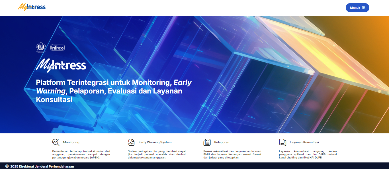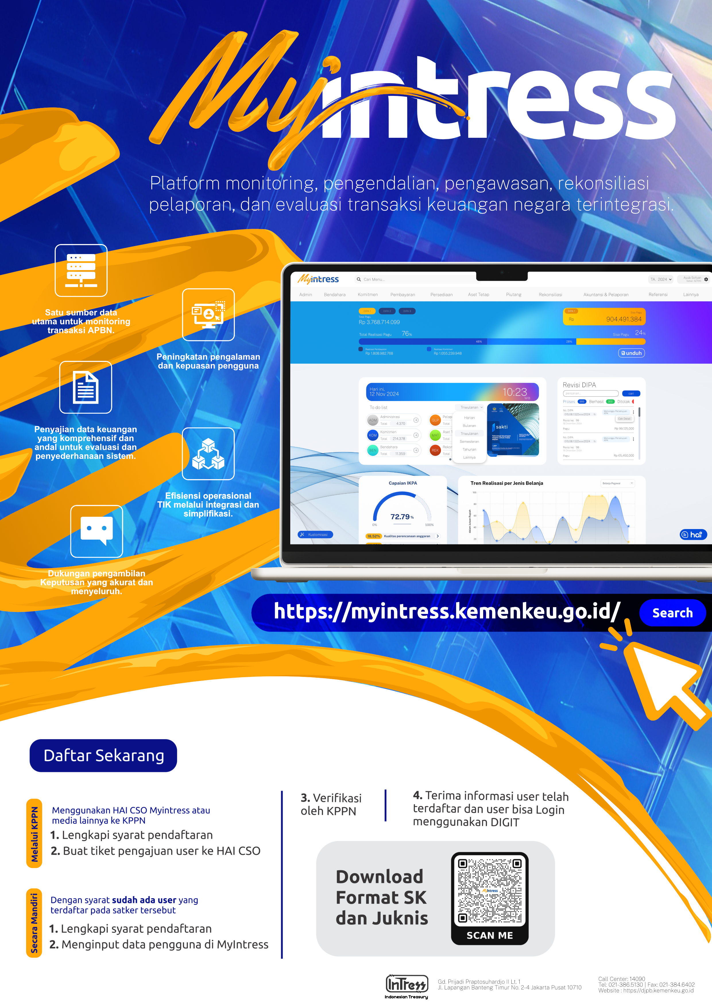 Kehadiran MyIntress diperkuat dengan terbitnya Peraturan Direktur Jenderal Perbendaharaan Nomor PER-19/PB/2025, yang menetapkan platform ini sebagai sistem tunggal untuk menggantikan peran aplikasi pendahulu, yakni OM-SPAN dan MonSAKTI, guna mewujudkan pengelolaan keuangan negara yang lebih modern dan akuntabel.