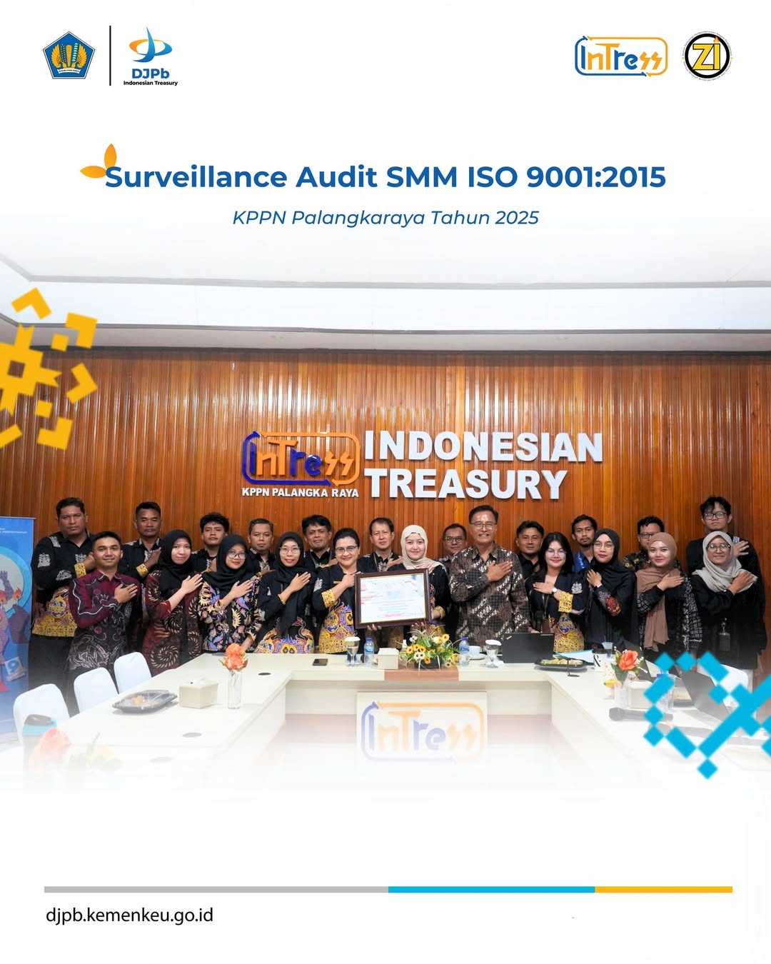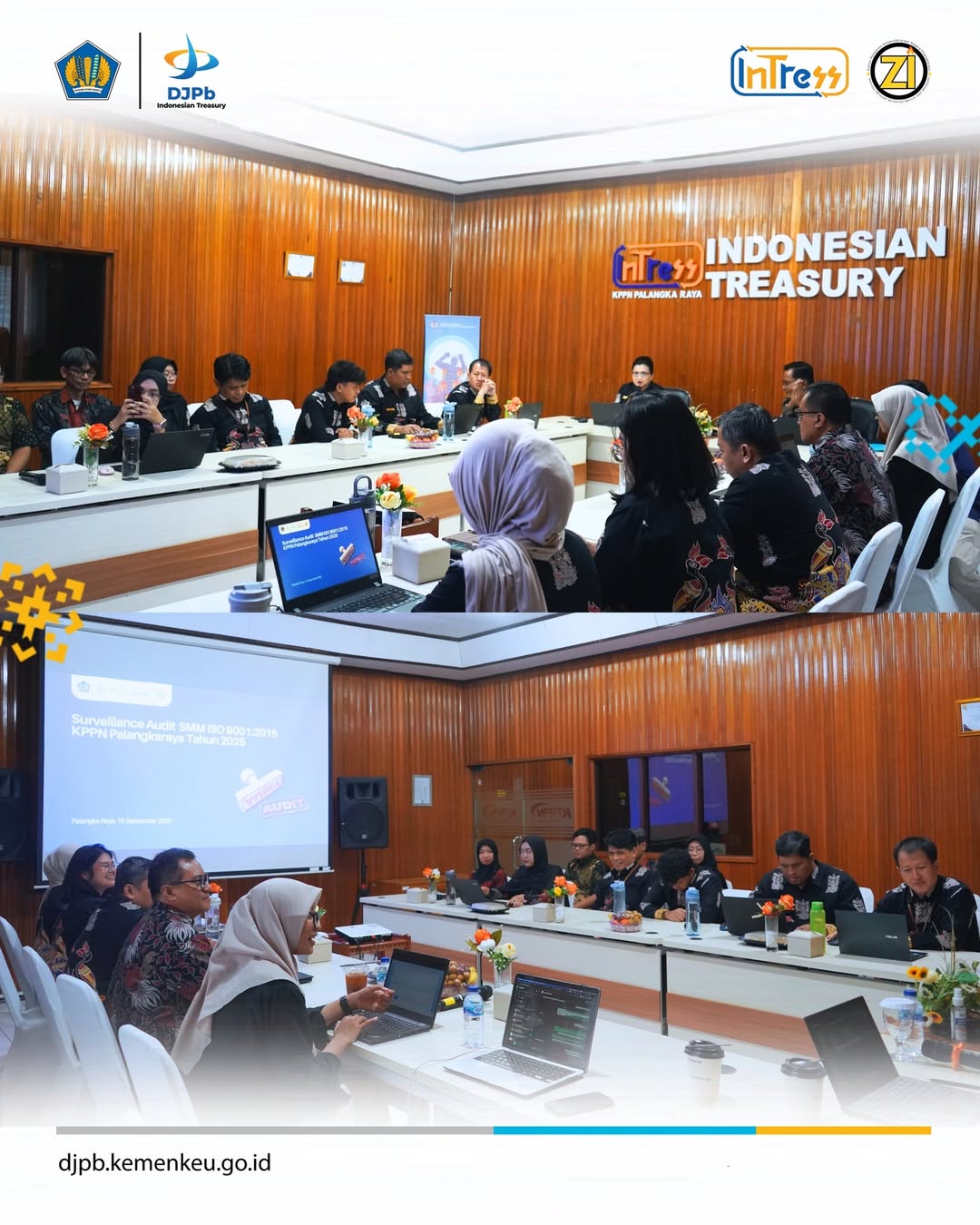 Pada hari Selasa, 16 September 2025, tim TUV Rheinland Indonesia melaksanakan audit eksternal ISO 9001:2015 (Sistem Manajemen Mutu) terhadap KPPN Palangkaraya. Audit ini menjadi bagian penting dari komitmen berkelanjutan KPPN Palangkaraya dalam memastikan bahwa seluruh proses kerja telah berjalan sesuai dengan standar mutu internasional. Kegiatan audit juga menjadi sarana untuk menjaga efektivitas sistem manajemen yang diterapkan, guna mewujudkan tata kelola perbendaharaan negara yang profesional, transparan, dan berstandar internasional.