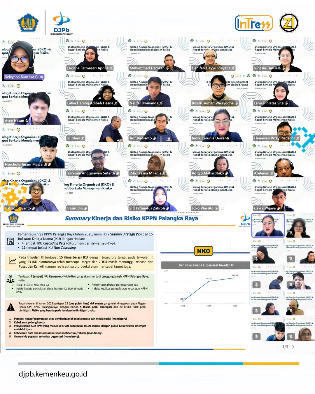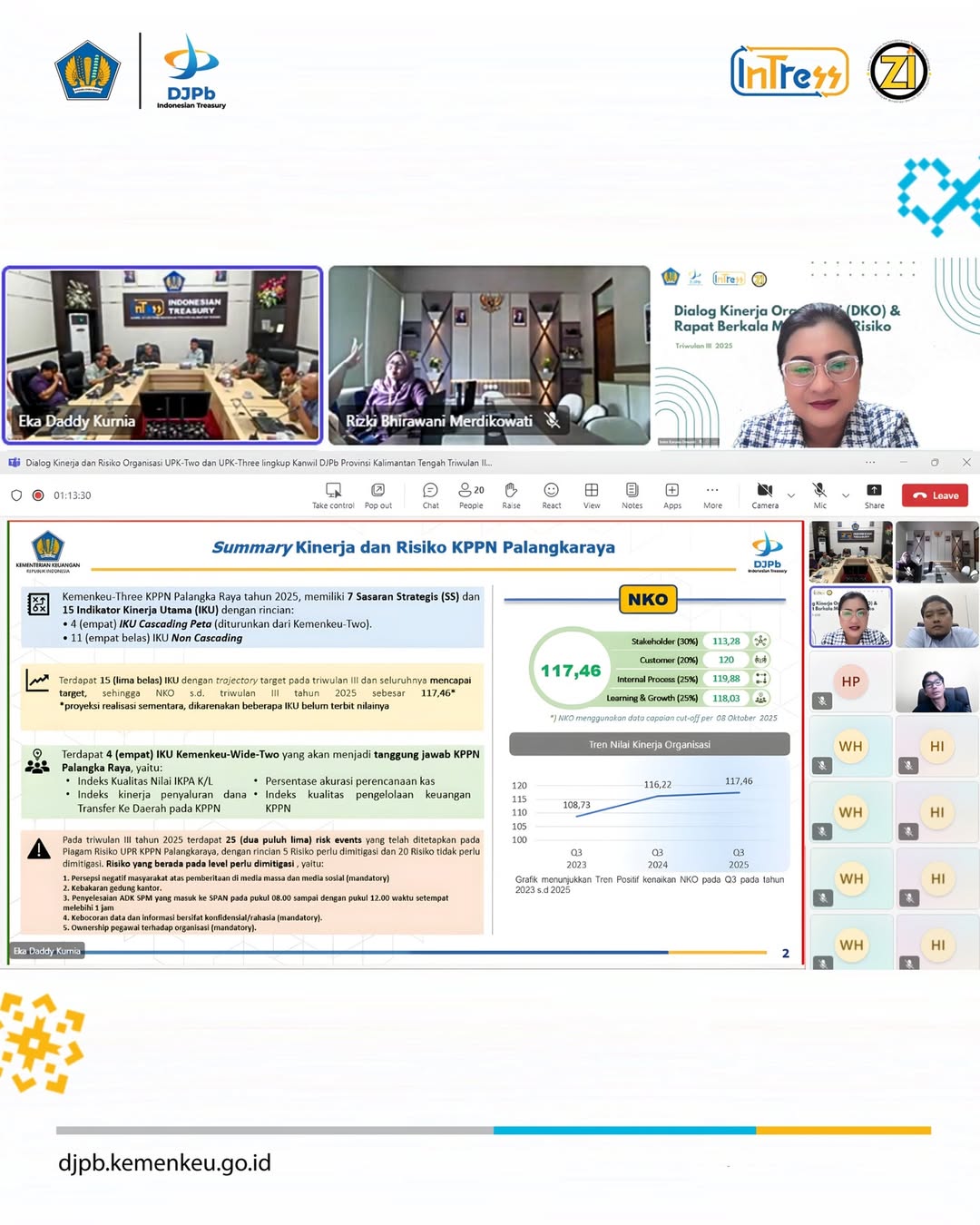 Pada tanggal 8 Oktober 2025, KPPN Palangkaraya menyelenggarakan Dialog Kinerja Organisasi (DKO) Triwulan III Tahun 2025, yang kemudian dilanjutkan dengan DKO lingkup Kanwil DJPb Provinsi Kalimantan Tengah pada tanggal 9 Oktober 2025 melalui media Microsoft Teams. Kegiatan ini menjadi forum penting dalam rangka melakukan pemantauan, pengendalian, dan evaluasi atas pelaksanaan kinerja organisasi selama triwulan berjalan.