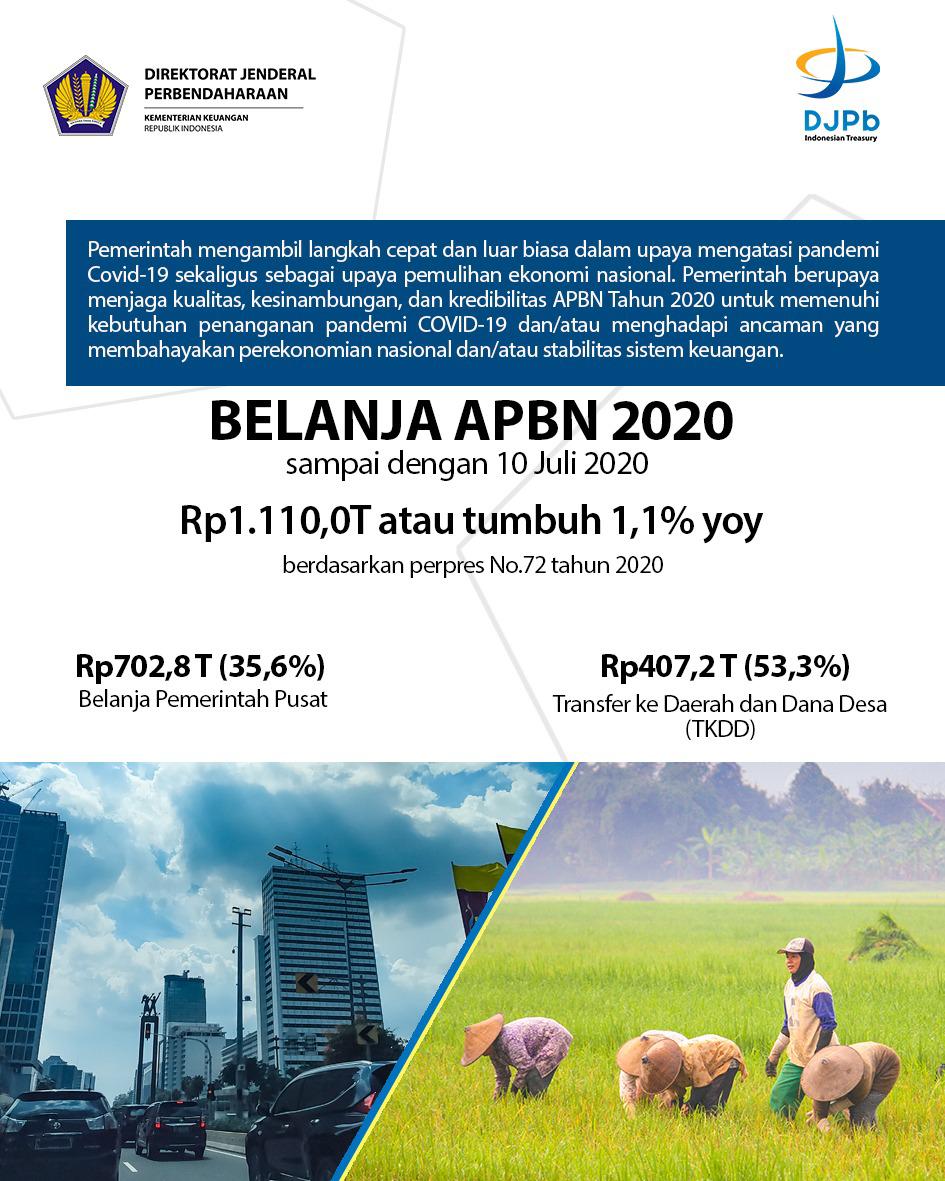 Belanja Negara secara keseluruhan sampai dengan 10 Juli 2020 mencapai 40,5% atau sebesar Rp1.110,0 triliun, tumbuh 1,1% yoy. Pertumbuhan belanja negara terutama masih dipengaruhi oleh Belanja Bansos K/L yang telah terealisasi 62,6% atau tumbuh sebesar 45,5% yoy.