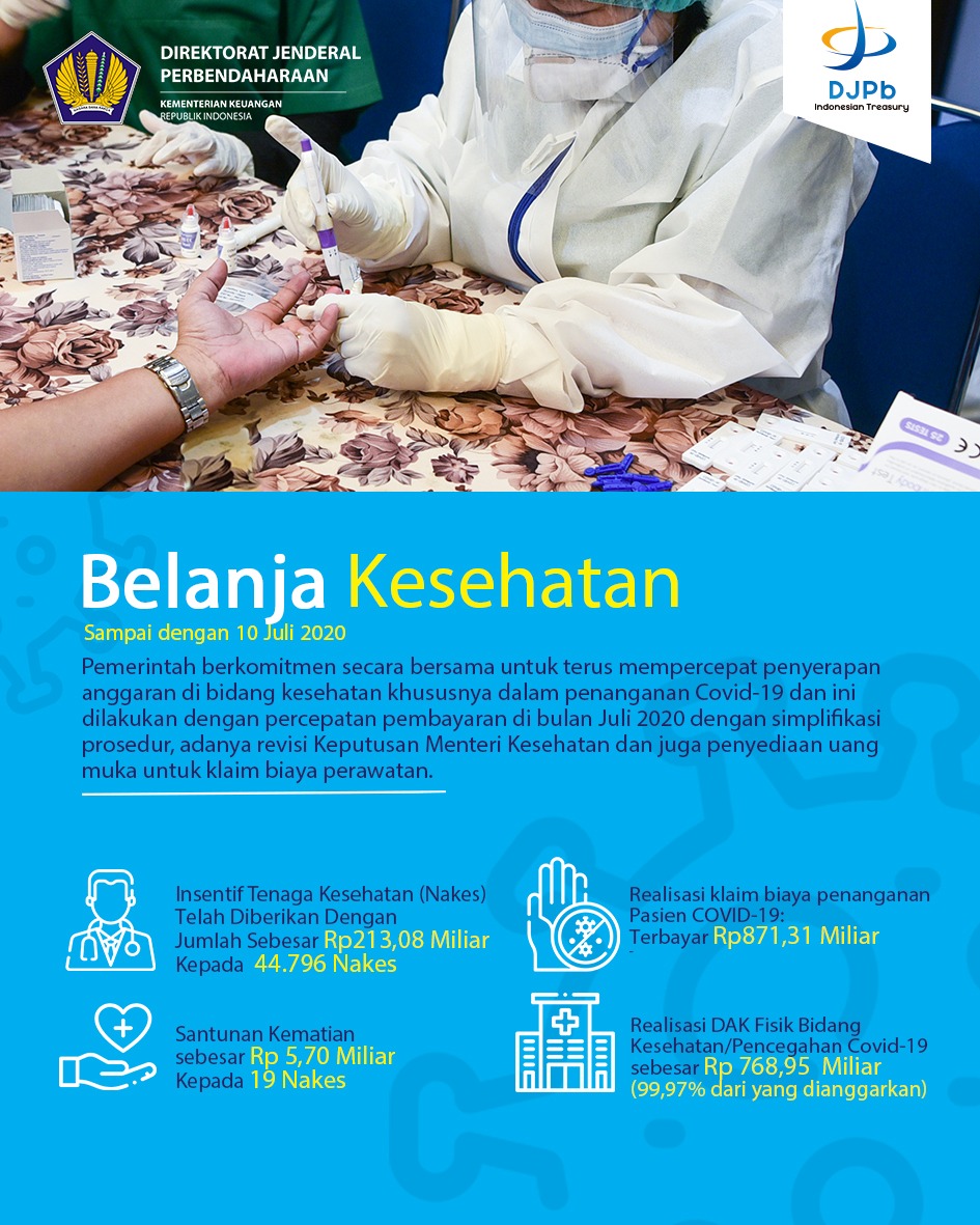 Khususnya di bidang kesehatan, pemerintah berkomitmen secara bersama untuk terus mempercepat penyerapan anggaran dalam penanganan COVID-19. Ini dilakukan dengan percepatan pembayaran di bulan Juli 2020 lewat simplifikasi prosedur, adanya revisi Keputusan Menteri Kesehatan, juga penyediaan uang muka untuk klaim biaya perawatan.