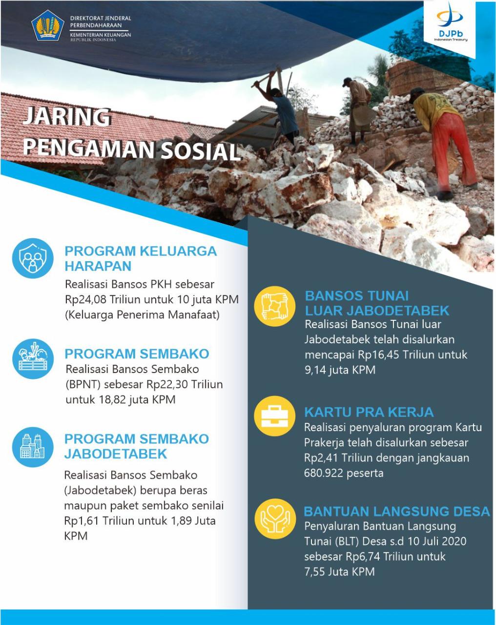 Realisasi Belanja K/L pada tanggal 6 s.d. 10 Juli 2020 adalah sebesar Rp8,6 triliun, terutama terdiri atas belanja Bansos yang sebesar Rp1,3 triliun. Berdasarkan kinerja APBN semester I, program perlindungan sosial telah menjangkau 60% masyarakat bawah. Program perlindungan sosial termasuk bansos bertujuan untuk menekan kenaikan Tingkat Pengangguran Terbuka (TPT) dan Tingkat Kemiskinan. Adapun Belanja Modal adalah sebesar Rp1,1 triliun, terutama untuk pelaksanaan proyek infrastruktur jalan, jembatan, dan bendungan oleh Kementerian PUPR. Sedangkan Program Padat Karya Tunai di 4 K/L telah terealisasi sebesar Rp5,68 triliun.