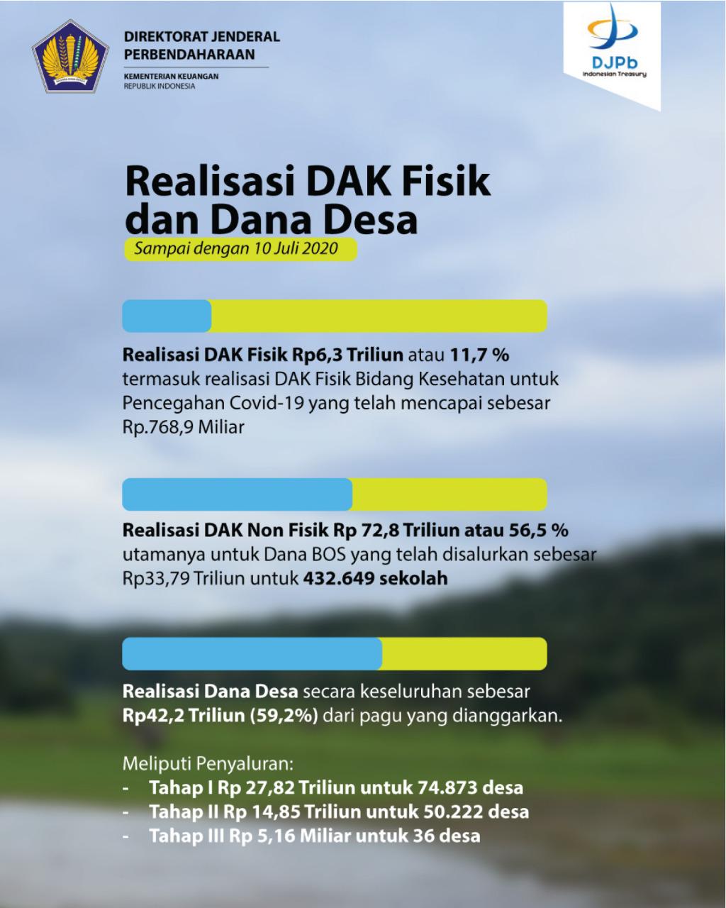 Adapun DAK Fisik dalam periode pekan lalu terealisasi sebesar Rp541,4 miliar, sehingga total sudah terealisasi Rp6,3 triliun. Ini termasuk DAK Fisik Bidang Kesehatan/Pencegahan COVID-19 sebesar Rp768,95 miliar atau sudah mencapai 99,97% dari yang dianggarkan. Untuk memperkuat ketahanan Desa, Transfer Dana Desa di periode ini adalah sebesar Rp1,3 triliun, termasuk untuk BLT Dana Desa sebesar Rp821,1 miliar, sehingga total salur BLT DD sebesar Rp6,7 triliun untuk 7,5 juta KPM.