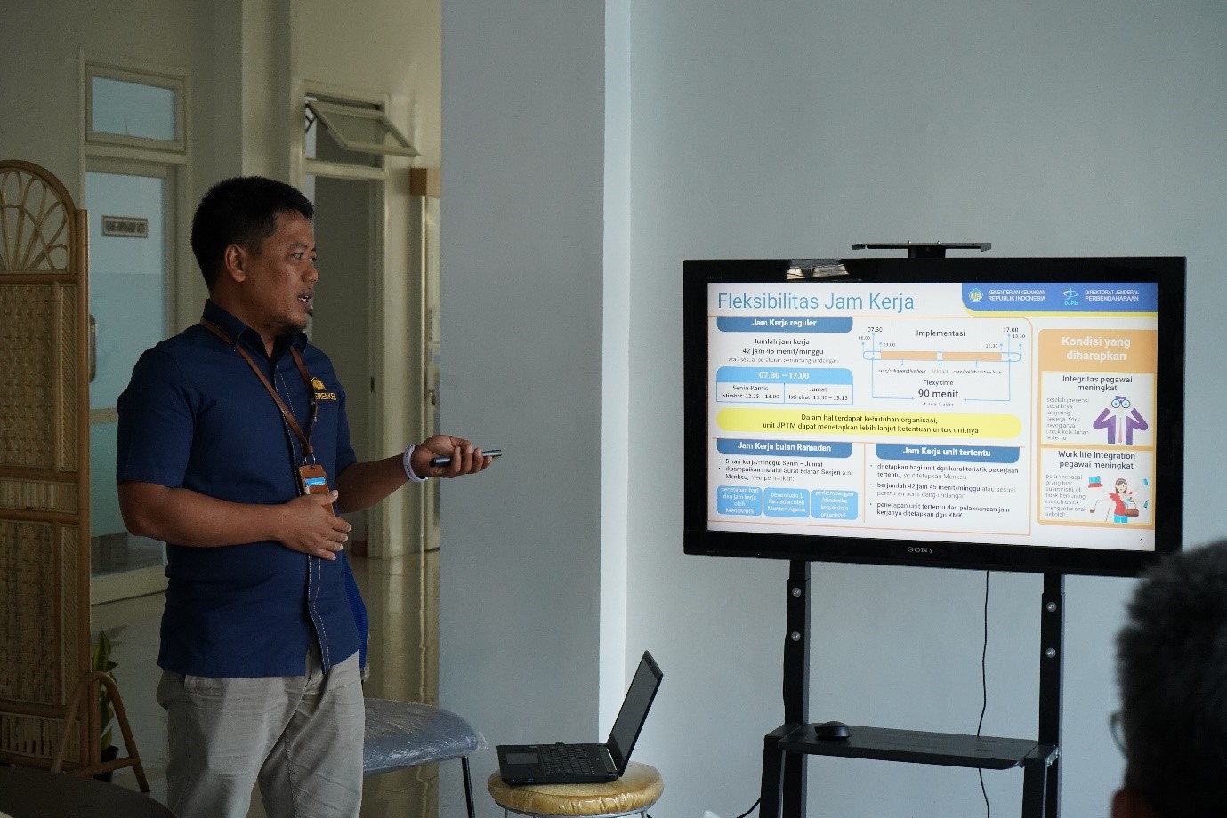 Pemateri kedua Sigit Harjanto Kepala Subbagian Umum mengenai PMK Nomor 221/PMK.01/2021 tentang Hari dan Jam Kerja serta Penegakan Disiplin Berkaitan dengan Pembayaran Tunjangan Pegawai di Lingkungan Kementerian Keuangan. Fleksibilitas Jam Kerja dan Ketentuan Presensi. Kategori Pelanggaran Jam Kerja. Pelanggaran Hari dan Jam Kerja. Perizinan dengan Alasan yang Sah. Cuti Besar, Cuti Alasan Penting, Cuti Sakit, dan cuti Melahirkan. Hari Bebas Kerja. Kebijakan Afirmasi Pegawai pada Unit Kerja Kementerian Keuangan di Tempat yang Sulit Perhubungan (UK3TSP) (Remote Area).