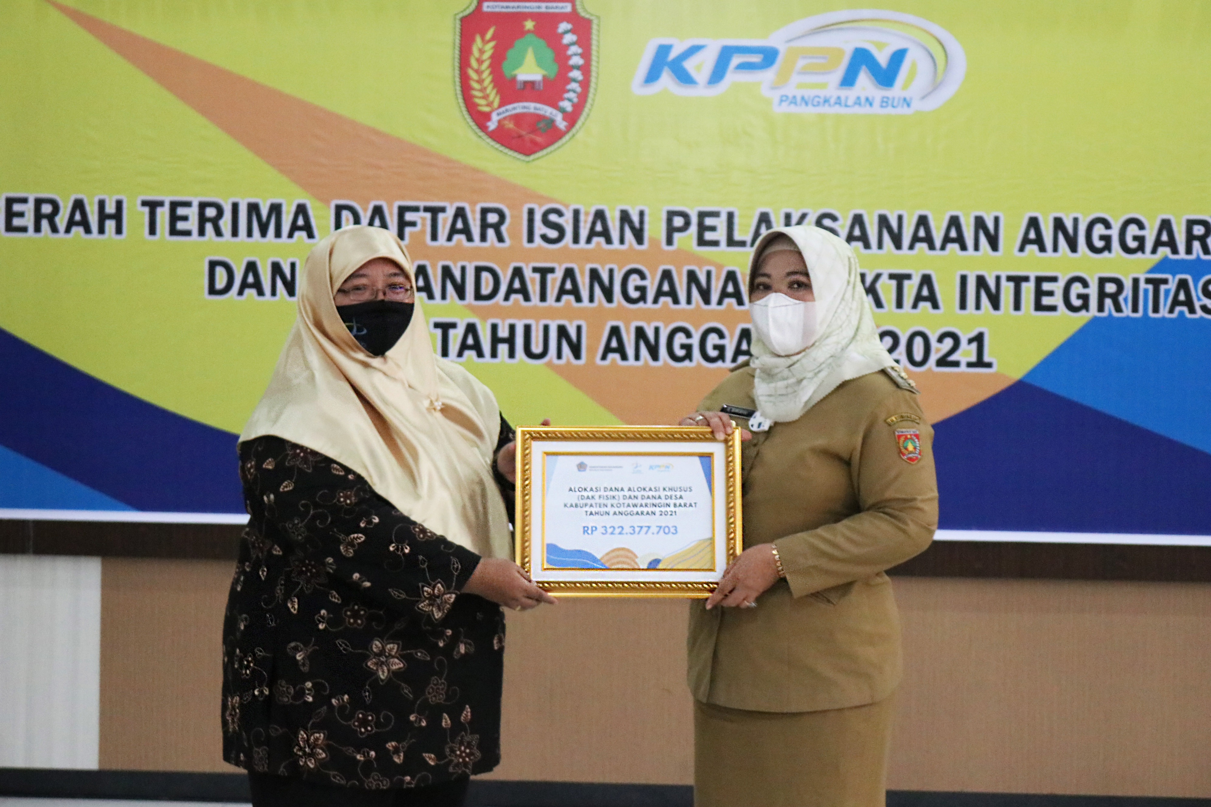 Kepala KPPN Pangkalan Bun Tjide Widiyarti bersama Bupati Kabupaten Kotawaringin Barat Hj. Nurhidayah, S.H., M.H, menyerahkan Daftar Isian Pelaksanaan Anggaran (DIPA) dan Daftar Alokasi Transfer ke Daerah dan Dana Desa (TKDD) Tahun Anggaran (TA) 2021. Penyerahan DIPA yang dilaksanakan di Aula Kantor Bupati Kab. Kotawaringin Barat pada hari Selasa, 1 Desember 2020ini dilakukan secara simbolis kepada beberapa Pimpinan Satuan Kerja.