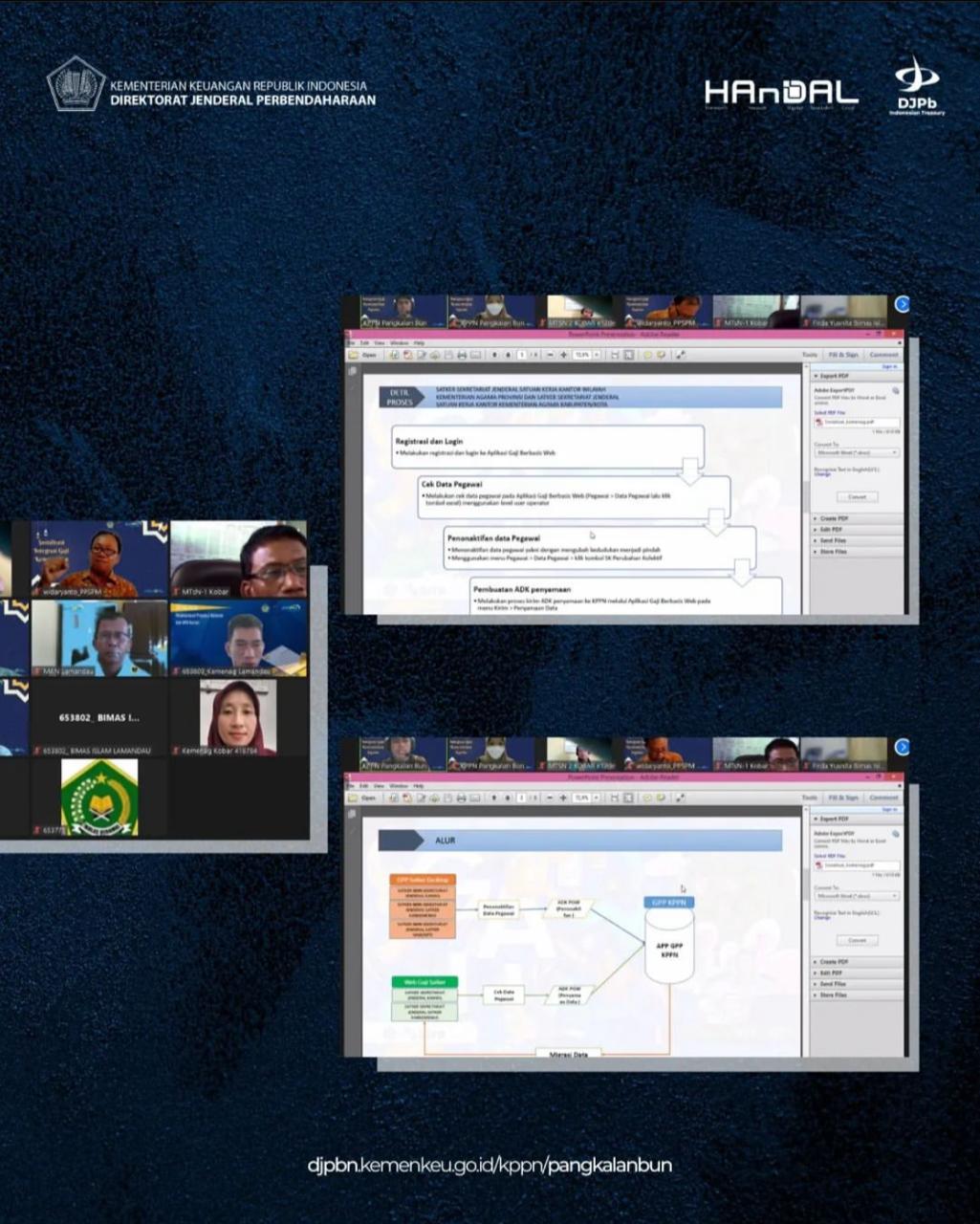 Pangkalan Bun - KPPN Pangkalan Bun melaksanakan kegiatan Sosialisasi Integrasi Gaji Kementerian Agama secara daring melalui zoom meeting. Kegiatan tersebut diikuti oleh Satker Kemenag lingkup KPPN Pangkalan Bun yang terdiri dari Kantor Kemenag dan Madrasah di 3 kabupaten, yaitu Kabupaten Kotawaringin Barat, Sukamara, dan Lamandau.