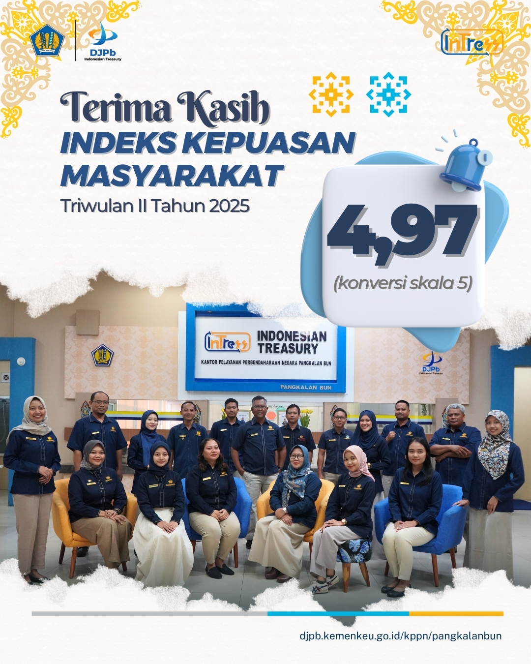 Dengan ini diumumkan hasil Survei Indeks Kepuasan Masyarakat (IKM) Triwulan II Tahun 2025 adalah sebesar 4,97 (skala 5), dengan demikian dapat disimpulkan bahwa pelaksanaan pelayanan publik KPPN Pangkalan Bun mencerminkan tingkat kualitas A atau Sangat Baik. Di samping itu, KPPN Pangkalan Bun juga mendapatkan nilai Indeks Persepsi Anti Korupsi sebesar 4,97 dan Indeks Inklusivitas sebesar 4,83.