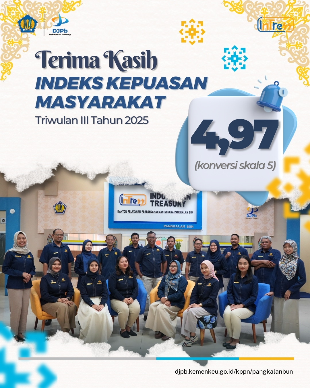 Dengan ini diumumkan hasil Survei Indeks Kepuasan Masyarakat (IKM) Triwulan III Tahun 2025 adalah sebesar 4,97 (skala 5), dengan demikian dapat disimpulkan bahwa pelaksanaan pelayanan publik KPPN Pangkalan Bun mencerminkan tingkat kualitas A atau Sangat Baik. Di samping itu, KPPN Pangkalan Bun juga mendapatkan nilai Indeks Persepsi Anti Korupsi sebesar 4,99 dan Indeks Inklusivitas sebesar 4,95.