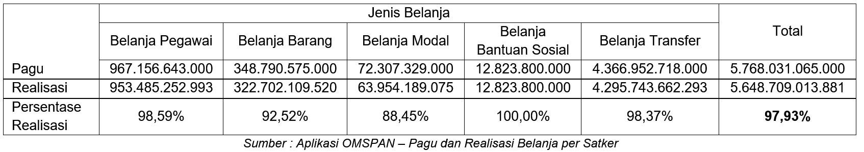 Belanja Bansos berhasil direalisasikan secara maksimal hingga 100% dari pagu yang tersedia. Untuk Belanja Modal dan Belanja Barang, masing-masing dapat direalisasikan sebesar 88,45% dan 92,52%. Apabila dibandingkan secara yoy, kinerja realisasi Belanja Modal mengalami penurunan apabila dibandingkan TA 2024 yang tercatat di angka Rp181.200.309.011 dari pagu Rp184.401.269.000 atau sekitar 98,26%. Sedangkan untuk Belanja Barang, terdapat peningkatan kinerja realisasi pada TA 2025 apabila dibandingkan dengan tahun sebelumnya yang diserap sebesar Rp530.003.444.007 dari total pagu Rp576.480.396.000 atau sebesar 91,94%. Kinerja realisasi Belanja Barang dan Belanja Modal pada TA 2025 sedikit banyak dipengaruhi oleh adanya pembayaran belanja kontraktual melalui mekanisme RPATA sebesar Rp19.314.243.777. Dari nominal tersebut, dilakukan pembayaran melewati TA 2025 sebesar Rp17.865.035.205 atau sekitar 92,49%, sehingga atas transaksi tersebut tercatat sebagai realisasi TA 2026.