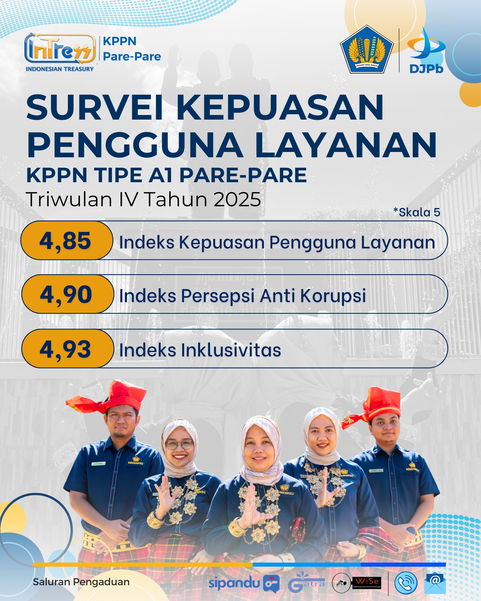 Dalam rangka membangun sistem penyelenggaraan pelayanan publik yang adil, transparan, dan akuntabel untuk meningkatkan kualitas pelayanan publik secara berkelanjutan, KPPN Pare-Pare telah menyelenggarakan Survei Kepuasan Pengguna Layanan (SKPL) Triwulan IV Tahun 2025 melalui e-SKPL dengan melibatkan para stakeholders.