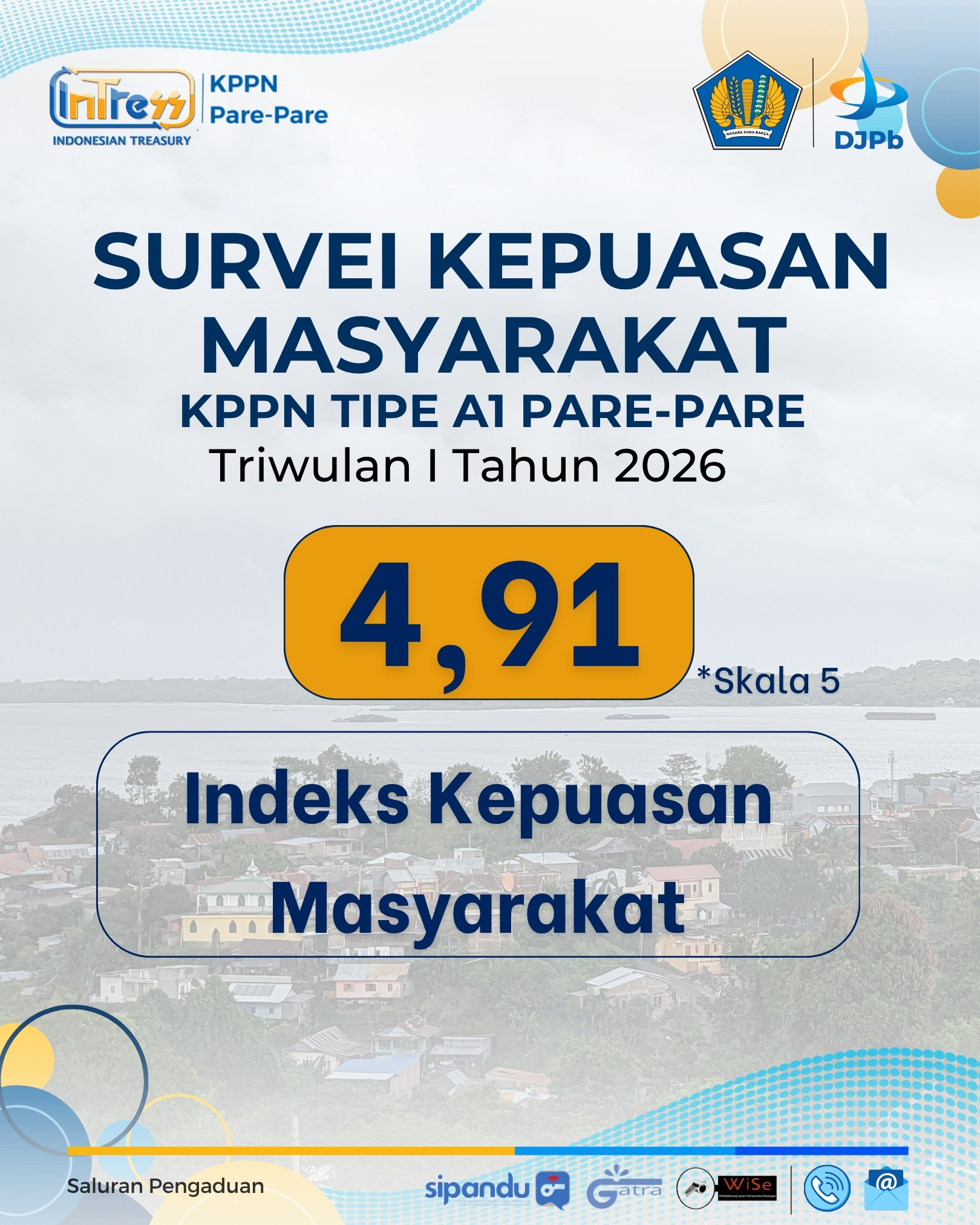 Berdasarkan hasil SKM Triwulan I Tahun 2026, KPPN Tipe A1 Pare-Pare memperoleh Indeks Kepuasan Masyarakat (IKM) sebesar 4,91 dari skala 5, dengan predikat Sangat Baik. Hasil Survei Kepuasan Masyarakat menjadi salah satu indikator adanya peningkatan dalam kualitas pelayanan oleh KPPN Tipe A1 Pare-Pare secara umum. Kami senantiasa berupaya untuk meningkatkan kualitas pelayanan kepada seluruh mitra kerja.