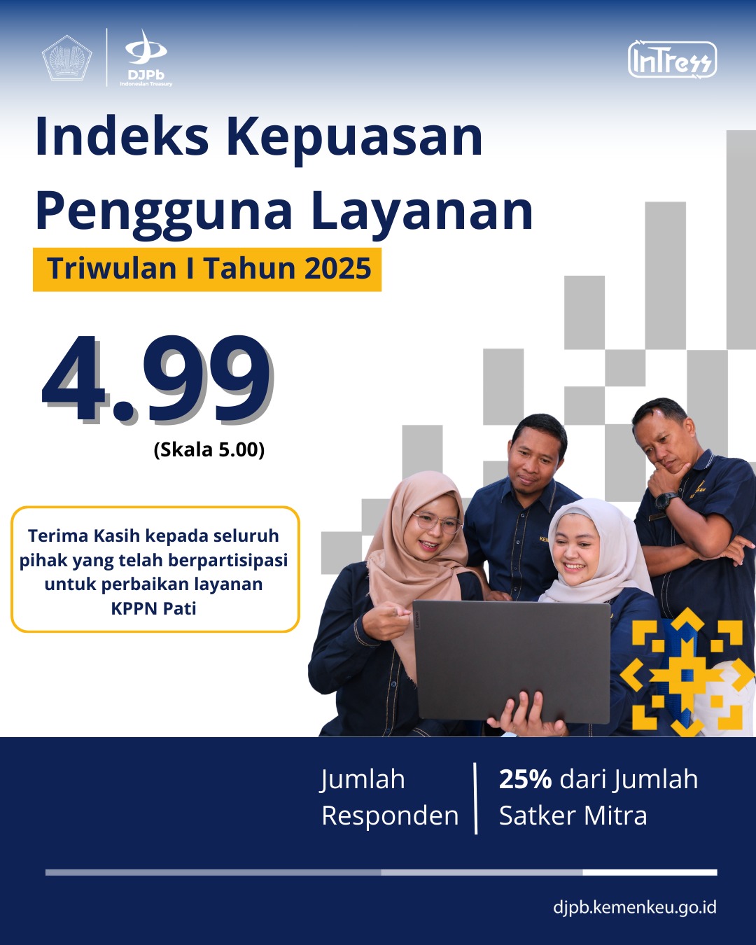 Hasil Survei Kepuasan Pengguna Layanan KPPN Pati Triwulan I Tahun 2025 menunjukkan capaian yang sangat membanggakan. Indeks Kepuasan Pengguna Layanan meraih nilai 4,99 (skala 5,00). Terima kasih atas partisipasi dan kepercayaan seluruh mitra yang terus mendukung peningkatan kualitas layanan KPPN Pati. 🙏✨
