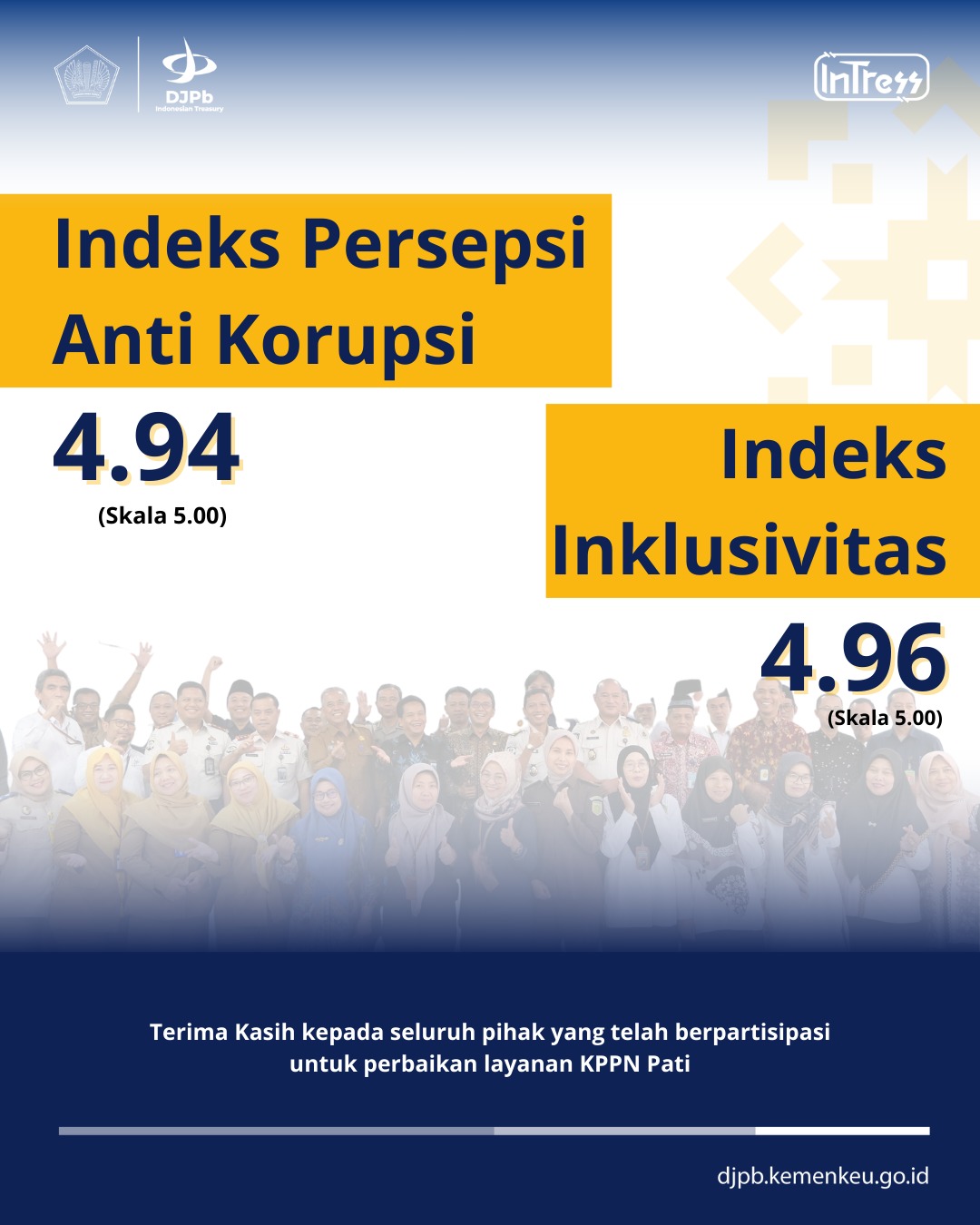 Hasil Survei Kepuasan Pengguna Layanan KPPN Pati Triwulan IV Tahun 2025 menunjukkan kinerja yang sangat baik. Indeks Kepuasan Pengguna Layanan mencapai 4,94, Indeks Persepsi Anti Korupsi 4,94, dan Indeks Inklusivitas 4,96 (skala 5,00). Terima kasih atas partisipasi dan kepercayaan seluruh mitra dalam mendukung peningkatan kualitas layanan KPPN Pati. 🙏✨