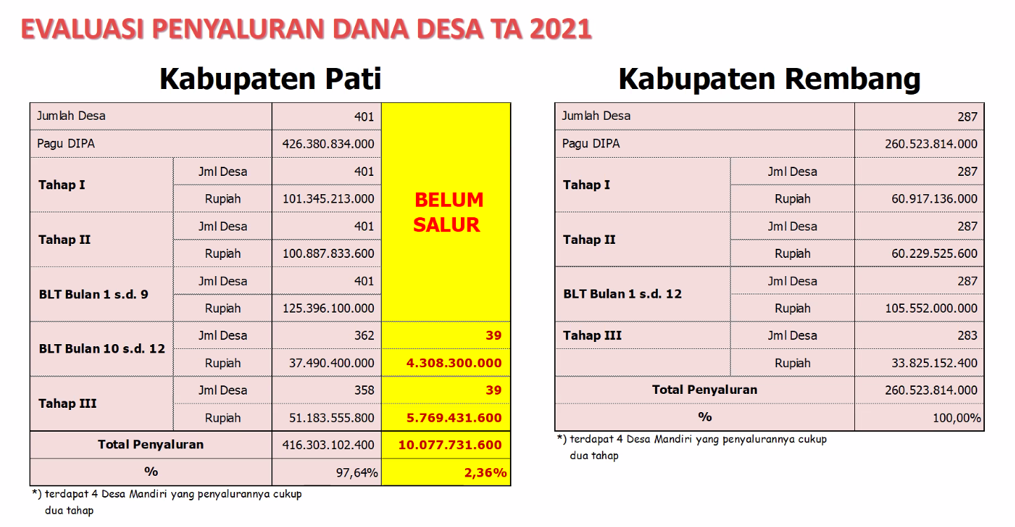 Berdasarkan pemaparan pada Rakor, penyaluran Dana Desa pada Kabupaten Rembang telah mencapai 100%, sedangkan Kabupaten Pati masih on progress untuk penyaluran dana Dana Desa Tahap III serta BLT bulan Oktober sd Desember 2021.