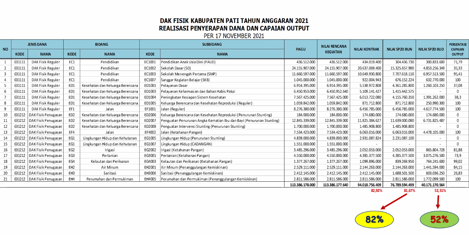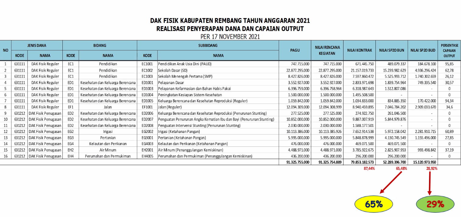 Untuk penyaluran DAK Fisik, Kabupaten Pati telah mencapai 90,48% sedangkan pada Kabupaten Rembang baru mencapai 65,48%.