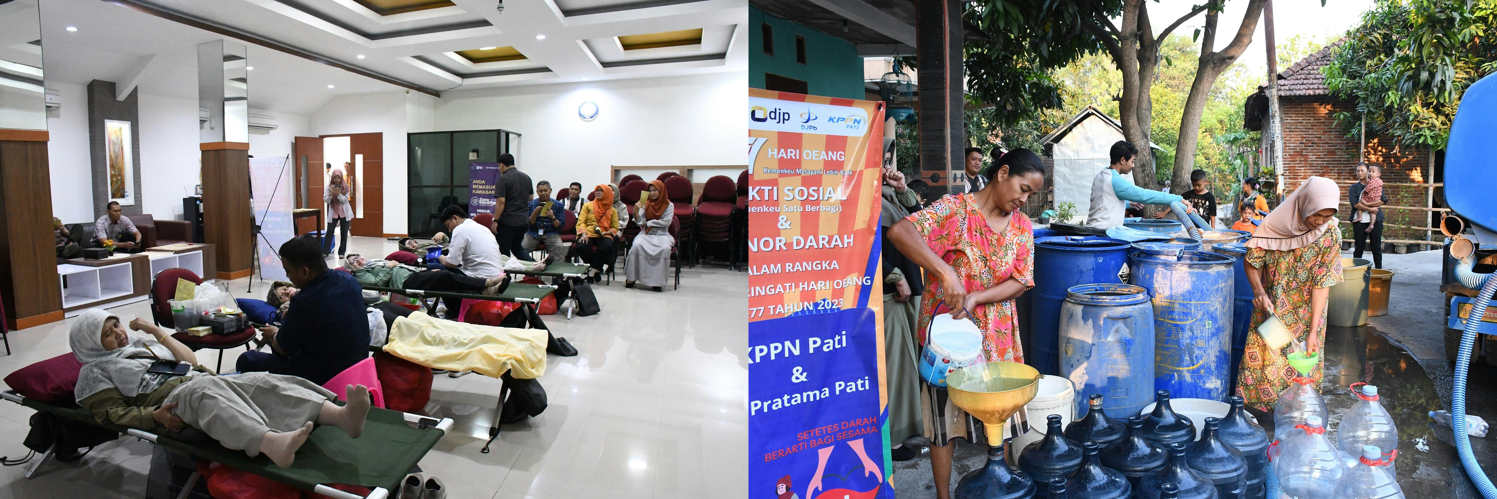 Kegiatan itu berupa Donor Darah, Berbagi Sembako, dan Bantuan Penyaluran Air Bersih kepada warga terdampak kekeringan di Kab. Pati, pada tanggal 17 dan 18 Oktober 2023. Kegiatan Donor Darah dilaksanakan di KPP Pratama Pati sebagai wujud semangat Kemenkeu Satu. Dari kegiatan donor darah tersebut, pegawai KPPN Pati menyumbangkan sekitar 2.800cc darah yang selanjutnya akan dimanfaatkan oleh PMI Kab. Pati.