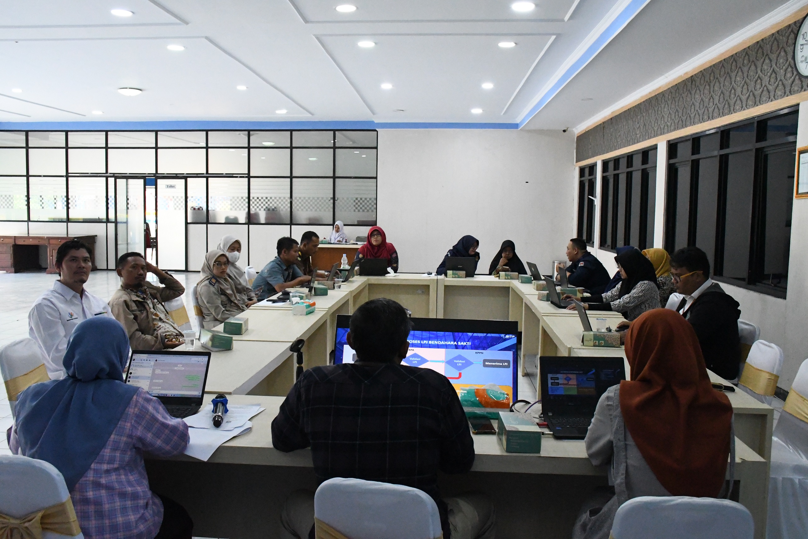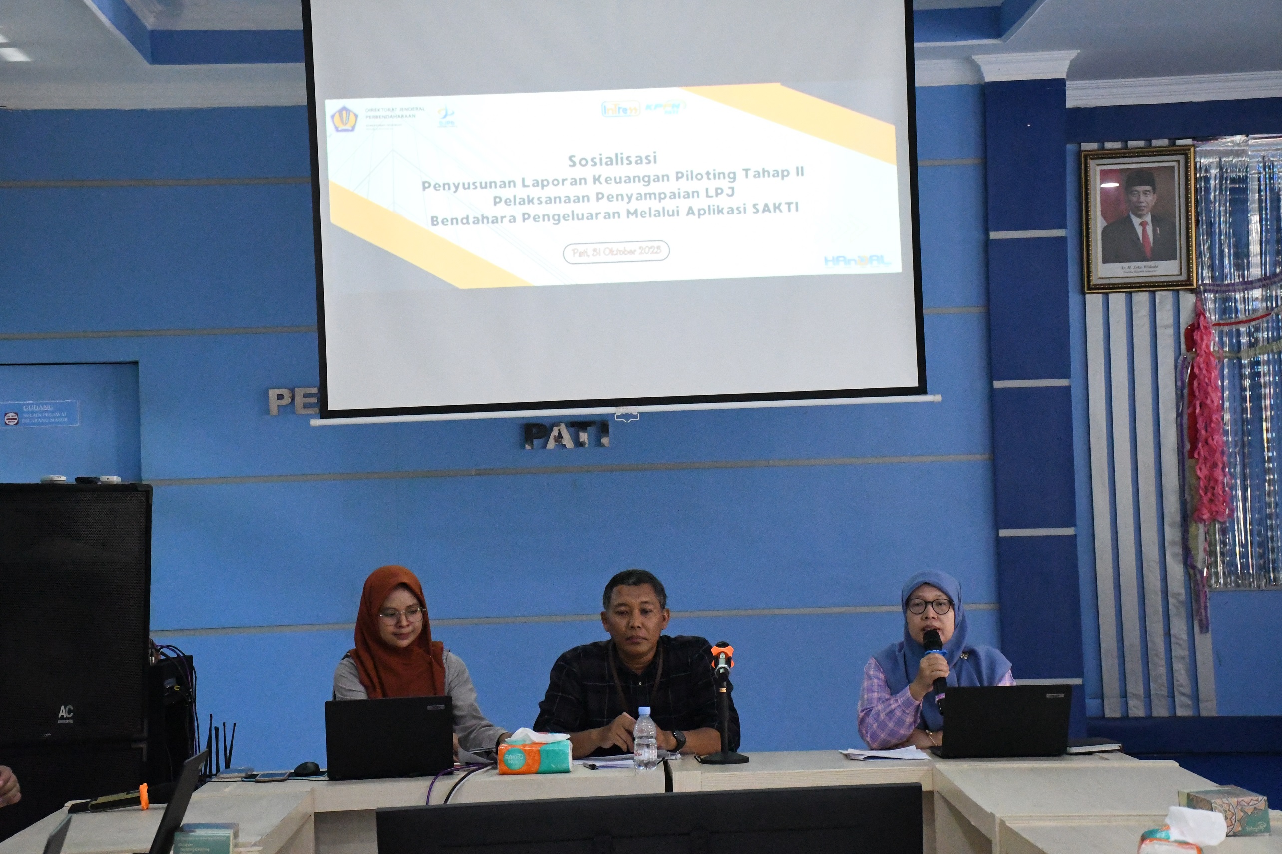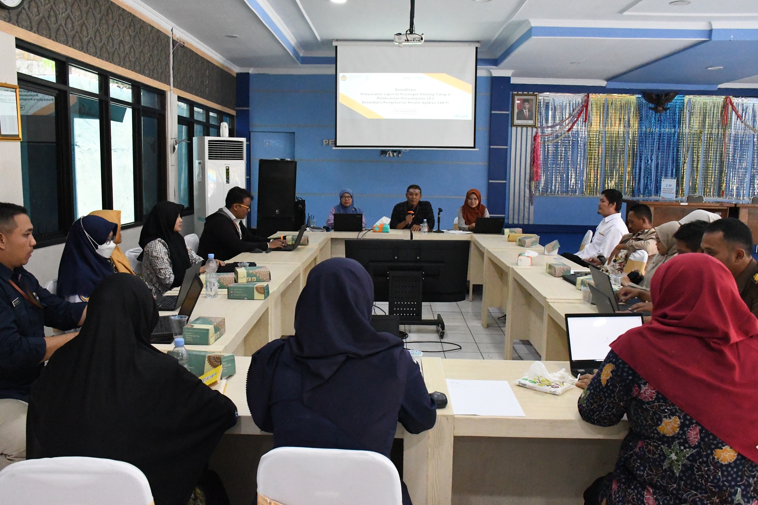 Menindaklanjuti Surat Direktur Jenderal Perbendaharaan Nomor S-180/PB/PB.3/22023 tanggal 20 Oktober 2023 hal Penetapan Piloting Tahap II Pelaksanaan Penyampaian dan Validasi LPJ Bendahara melalui Aplikasi SAKTI, KPPN Pati menyelenggarakan Kegiatan Sosialisasi Penyusunan Laporan Keuangan terkait Piloting Tahap II Pelaksanaan Penyampaian LPJ Bendahara Pengeluaran melalui Aplikasi SAKTI. Kegiatan tersebut dilaksanakan pada hari Selasa, 31 Oktober 2023 di Aula KPPN Pati dengan peserta yang diundang sebanyak 16 (enam belas) Bendahara Pengeluaran Satker Peserta piloting Tahap I dan II.