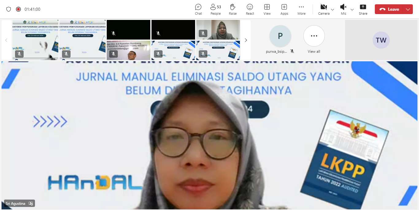 Pada hari Selasa tanggal 20 Februari 2024, KPPN Pati menyelenggarakan kegiatan Asistensi Penyusunan LK Satker terkait Jurnal Manual Eliminasi Saldo Utang yang Belum Diterima Tagihannya secara online melalui MS Teams yang dihadiri oleh Operator Pelaporan Satuan Kerja Lingkup KPPN Pati.