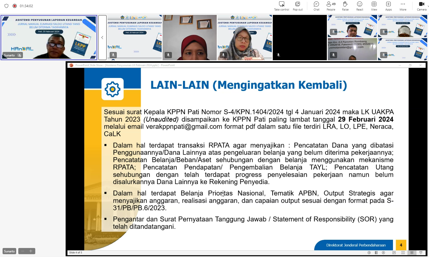 Pada sesi selanjutnya Kepala Seksi Verifikasi dan Akuntansi, Bapak Sunarto dan Staf Seksi Verifikasi dan Akuntansi secara bergantian menyampaikan materi Petunjuk Teknis Jurnal Manual Eliminasi Saldo Utang yang Belum Diterima Tagihannya.