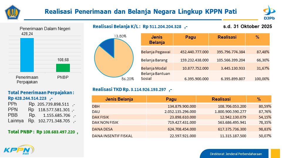 Realisasi Total Penerimaan Pajak sampai dengan bulan Oktober 2025 sebesar Rp.428.244.514.233,-. Sedangkan Total PNBP sebesar Rp.108.683.497.220,-.