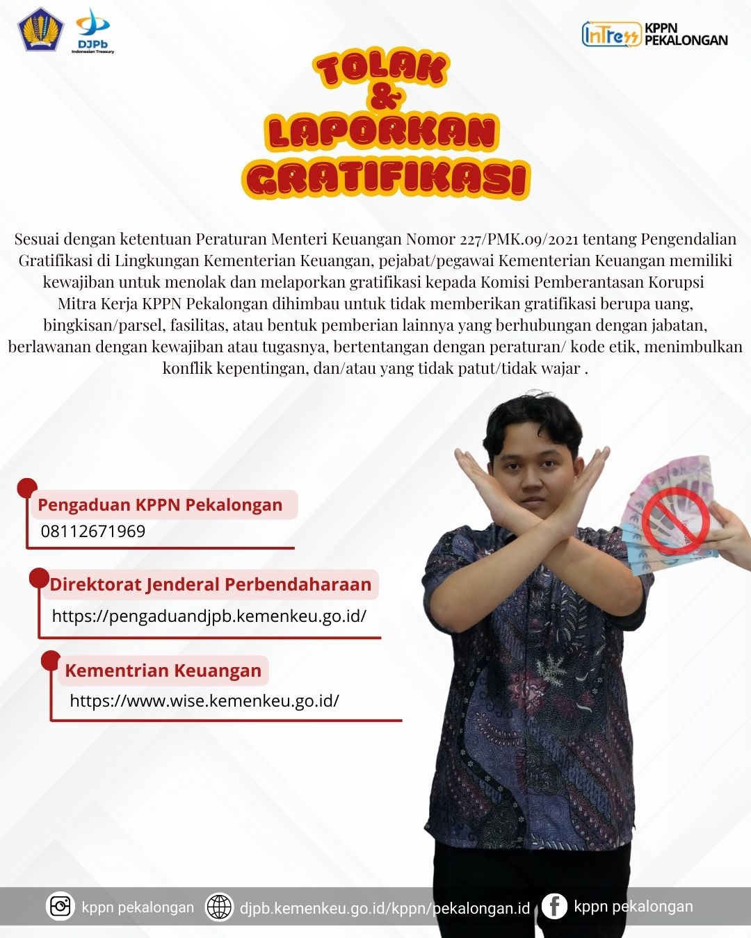 - Mitra Kerja KPPN Pekalongan dihimbau untuk tidak memberikan gratifikasi berupa uang, bingkisan/parsel, fasilitas, atau bentuk pemberian lainnya yang berhubungan dengan jabatan, bertentangan dengan kewajiban atau bertentangan, bertentangan dengan peraturan/kode etik, menimbulkan konflik kepentingan, dan/atau yang tidak patut/tidak wajar