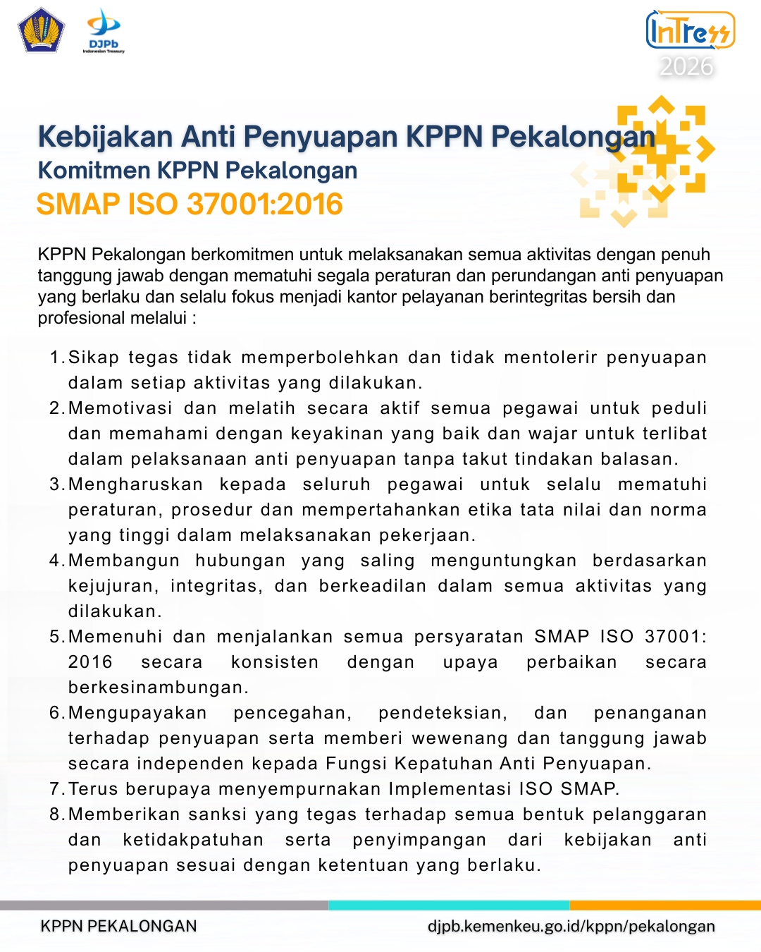 - Mitra Kerja KPPN Pekalongan dihimbau untuk tidak memberikan gratifikasi berupa uang, bingkisan/parsel, fasilitas, atau bentuk pemberian lainnya yang berhubungan dengan jabatan, berlawanan dengan kewajiban atau tugasnya, bertentangan dengan peraturan/ kode etik, menimbulkan konflik kepentingan, dan/atau yang tidak patut/tidak wajar