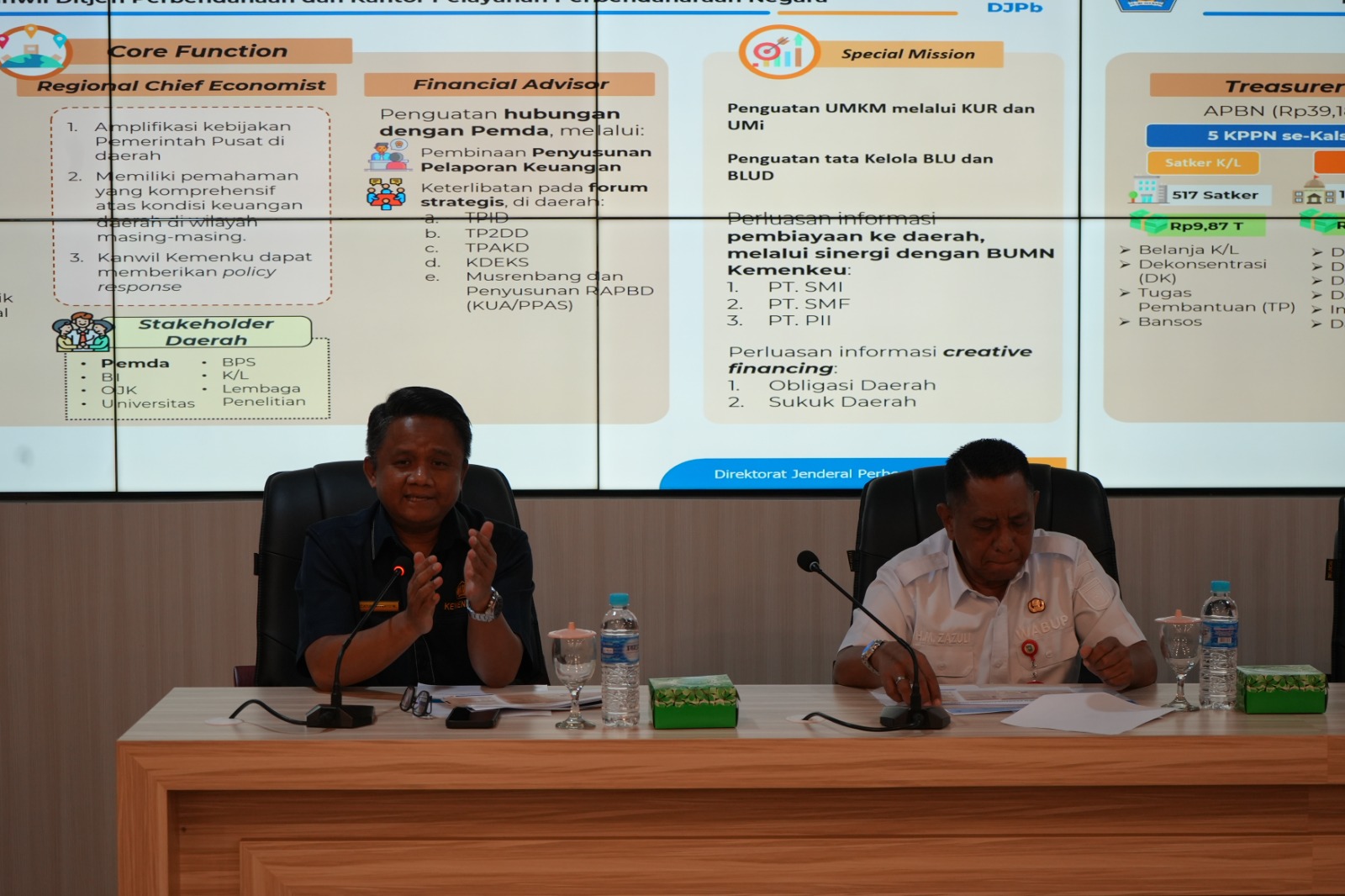 Bertempat di Ruang Barakat, pada Rabu, 27 Agustus 2025, Wakil Bupati Tanah Laut, H. M. Zazuli didampingi Asisten III Bupati, Rudi Ismanto beserta jajaran pimpinan OPD di lingkungan Pemda Tala menerima kunjungan kerja Kepala Kanwil Ditjen Perbendaharaan Provinsi Kalimantan Selatan, Catur Ariyanto Widodo dan Kepala Kanwil Ditjen Kekayaan Negara Kalimantan Selatan dan Tengah, Tetik Fajar Ruwandari. Kunjungan kerja tersebut merupakan agenda rutin yang dilaksanakan Perwakilan Kementerian Keuangan di Kalimantan Selatan guna sinergi dalam pelaksanaan tugas dan fungsi di bidang Treasury, Regional Chief Economist dan Financial Advisory kepada Pemerintah Daerah.