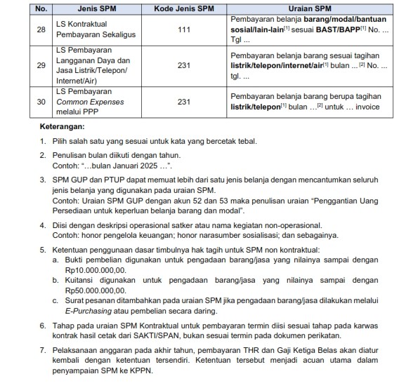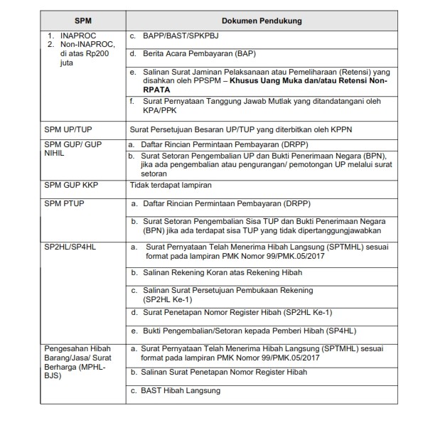 Dalam rangka untuk melaksanakan Keputusan Direktur Jenderal Perbendaharaan nomor KEP-244/PB/PB.1/2023 tentang Standar Operasional Prosedur Reguler Pada Kantor Pelayanan Perbendaharaan Negara, Nomor SOP: 31.KPN.02.2023 dan Nomor SOP: 32.KPN.02.2023, serta memedomani ketentuan Peraturan Pemerintah (PP) nomor 45 tahun 2013 tentang Tata Cara Pelaksanaan Anggaran Pendapatan dan Belanja Negara s.t.d.d. Peraturan Pemerintah nomor 50 tahun 2018, dan Peraturan Menteri Keuangan (PMK) nomor 62 tahun 2023 tentang Perencanaan Anggaran, Pelaksanaan Anggaran, serta Akuntansi dan Pelaporan Keuangan s.t.d.d. PMK Nomor 107 Tahun 2024, berikut kami sampaikan Ketentuan Uraian dan kelengkapan Dokumen Pendukung SPM, Permohonan Persetujuan Tambahan TUP, Pengajuan SPM LS Bendahara, dan Pelaksanaan Digitalisasi Pembayaran (Transaksi Non Tunai) melalui Surat Kepala KPPN Pelaihari nomor S-17/KPN.1904/2026 tanggal 8 Januari 2026.