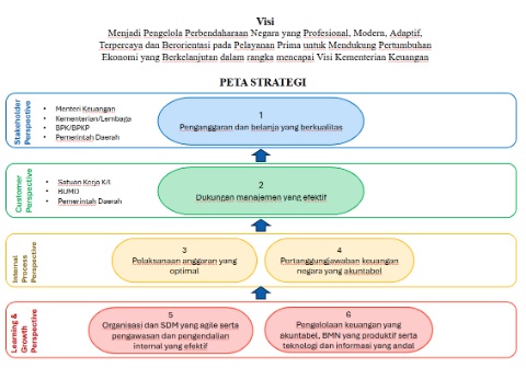 Dalam perencanaan kinerja, Kementerian Keuangan menggunakan sistem manajemen kinerja berbasis Balanced Scorecard (BSC). Sistem berkenaan bertujuan menerjemahkan Visi, misi, tujuan, dan strategi ke dalam kerangka operasional serta untuk membantu mewujudkan kinerja organisasi dan pegawaj yang maksimal. Keberhasilan suatu organisasi dalam meningkatkan kinerja diantaranya dapat diukur melalui pencapaian target kinerja yang ditetapkan dalam dokumen perencanaan kinerja. Sesuai dengan Keputusan Menteri Keuangan Nomor 300/KMK.01/2022 tentang Manajemen Kinerja di Lingkungan Kementerian Keuangan disebutkan bahwa Perencanaan kinerja mencakup proses penyusunan dan penetapan dokumen kinerja, yang terdiri atas: