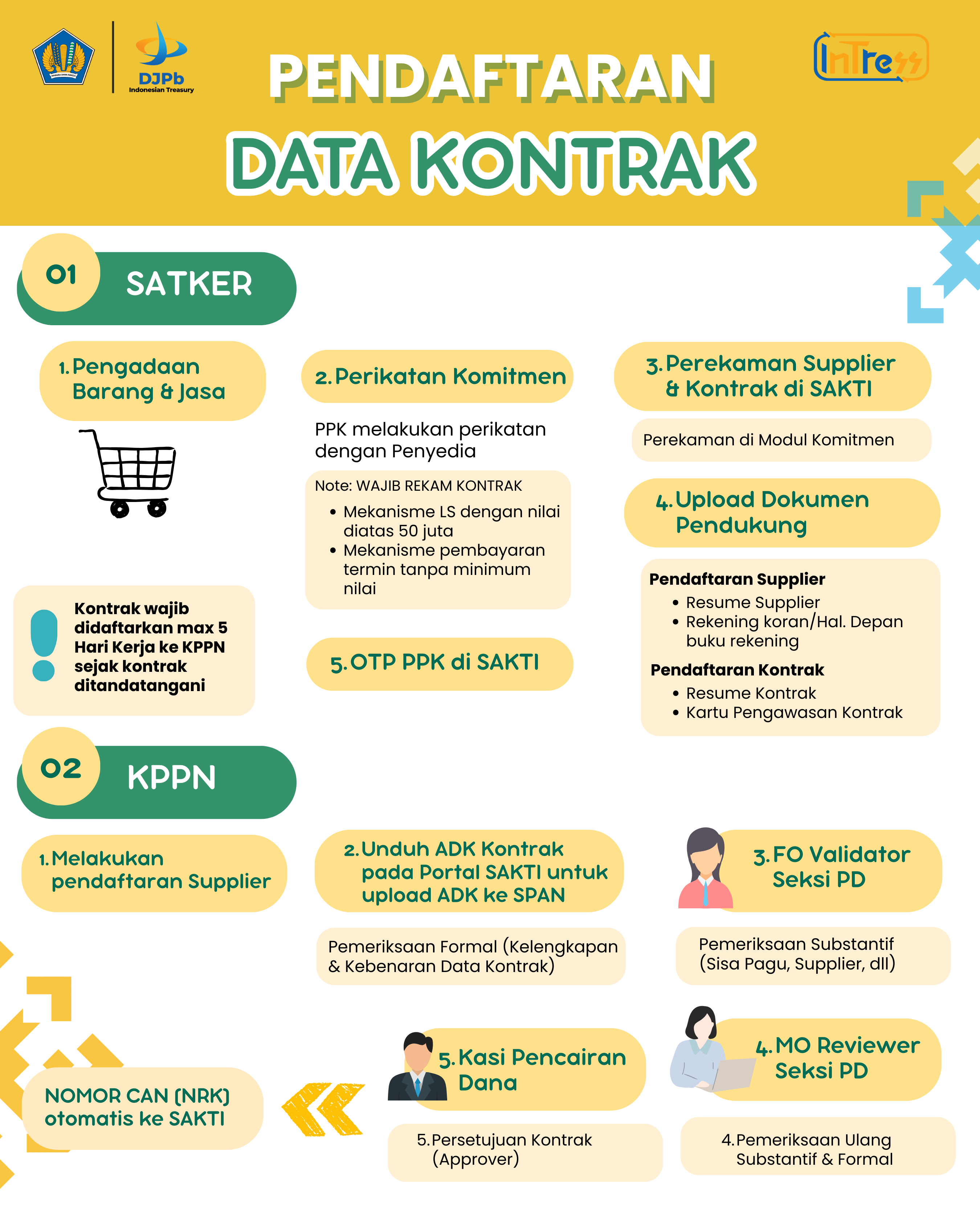 Dalam rangka pelaksanaan pembayaran yang bersifat kontraktual, Satker wajib mendaftarkan data kontrak dilakukan paling lambat 5 hari kerja setelah kontrak/SPK ditandatangani untuk dicatat ke dalam database SPAN. Data kontrak dimaksud meliputi: Informasi Umum, Informasi Khusus, dan Informasi Pembebanan.