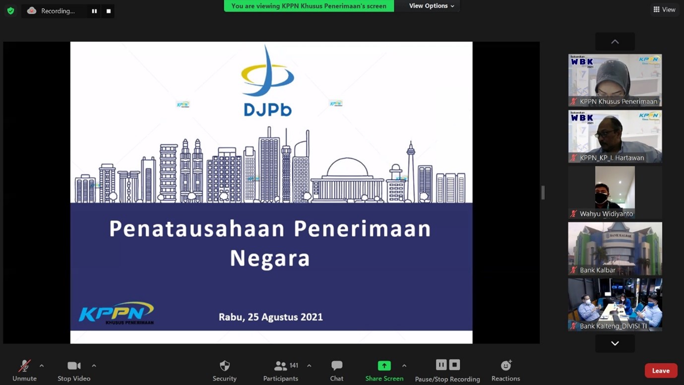 Rabu (25 Agustus 2021) KPPN Khusus Penerimaan mengadakan kegiatan Sosialisasi Pembangunan Zona Integritas dalam rangka Wilayah Bebas Korupsi pada KPPN Khusus Penerimaan. Kegiatan yang dilakukan pada situasi pandemi ini dihadiri oleh perwakilan 90 Collecting Agent secara daring melalui zoom meeting.