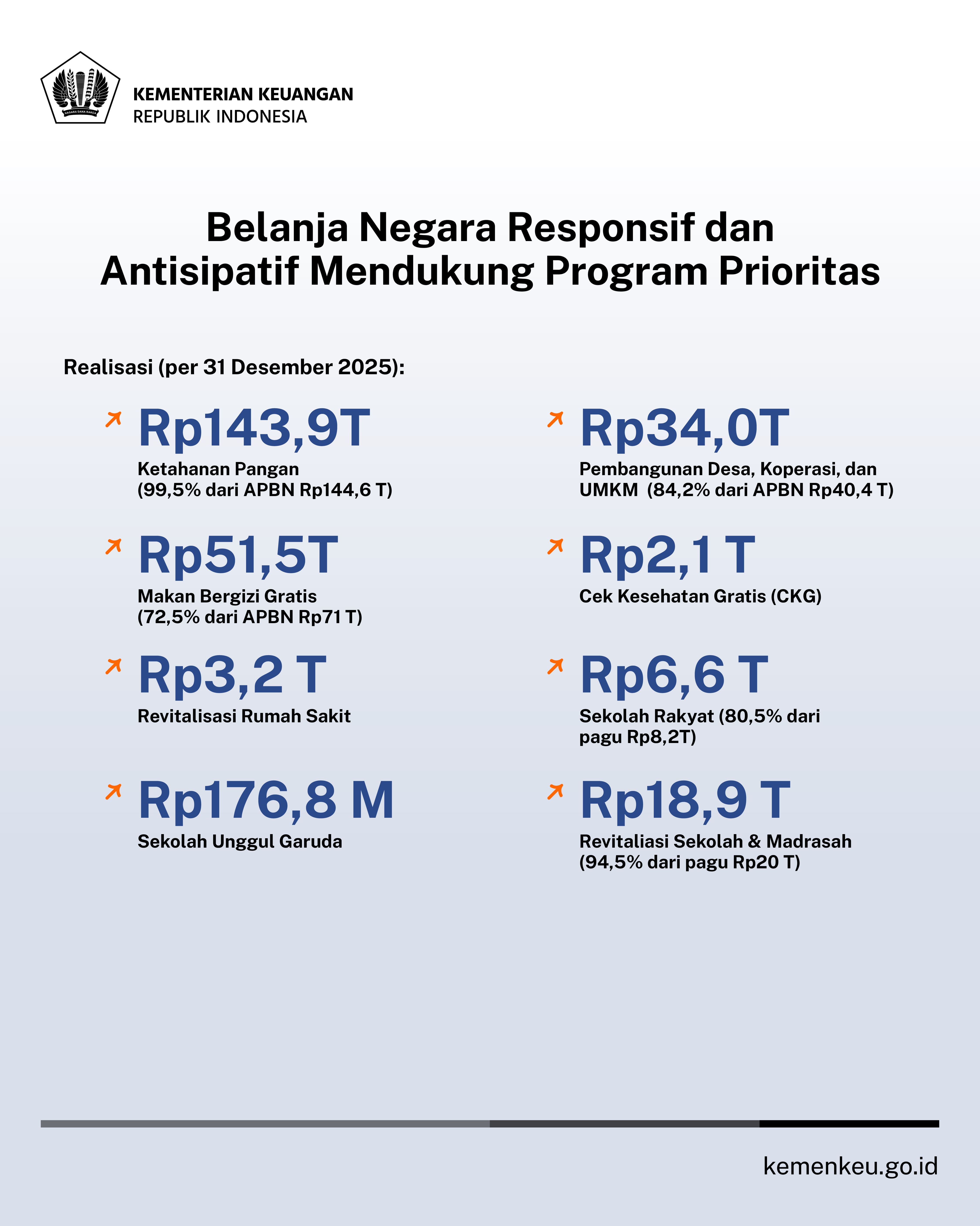 Belanja negara tetap 𝘰𝘯 𝘵𝘳𝘢𝘤𝘬, dengan efisiensi, namun tetap menjaga belanja bantuan sosial dan kepentingan serta kebutuhan rakyat.
