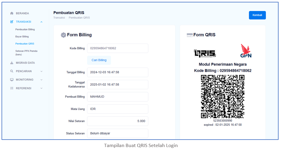 - Sistem akan menampilkan detail billing dan QR Code yang dapat langsung dipindai untuk pembayaran.