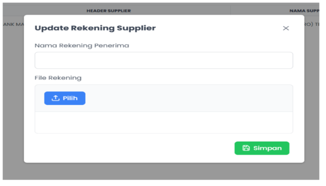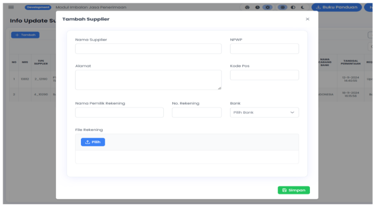 Pada saat merekam supplier baru, User mengisi kolom Nama Supplier, NPWP, Alamat, Kode Pos, Nama Pemilik Rekening, No. Rekening, Bank, kemudian User dapat menunggah dokumen pendukung penambahan supplier tersebut, (Scan dokumen Rekening Koran dan NPWP), kemudian klik ‘SIMPAN’.
