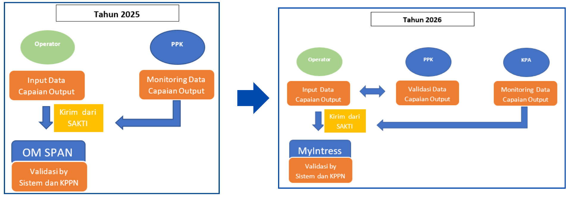 Mengawali tahun 2026, fungsi kendali internal atas capaian output diperkuat dengan mengembalikan peran langsung Pejabat Pembuat Komitmen (PPK) untuk melakukan konfirmasi Data Capaian Output yang telah direkam oleh Operator (staf PPK). Selain PPK, Kuasa Pengguna Anggaran (KPA) juga dilibatkan dalam melakukan monitoring dan reviu atas isian data realisasi capaian output Satker. Gambar dibawah ini menunjukkan perubahan skema proses bisnis pelaporan capaian output pada 2026 dibandingkan dengan tahun sebelumnya.