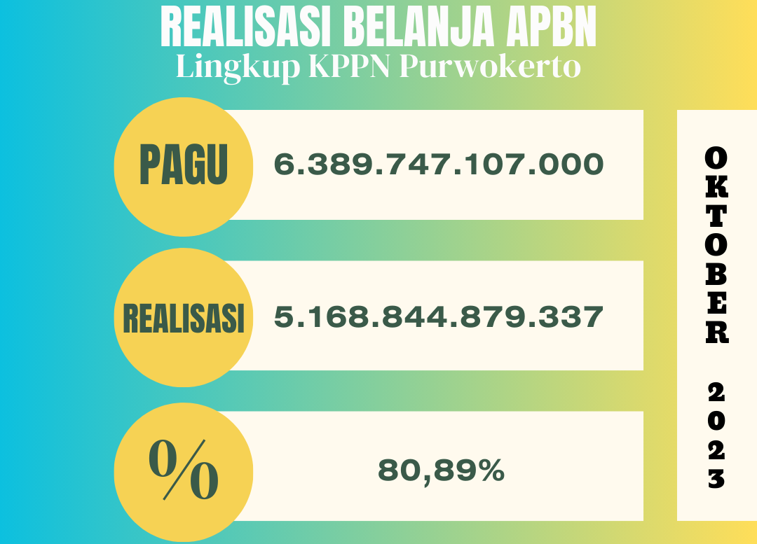 Sampai dengan 31 Oktober 2023 realisasi belanja yang disalurkan oleh Kantor Pelayanan Perbendaharaan Negara Purwokerto Purwokerto sebesar Rp5.168.844.879.337,00 (lima triliun seratus enam puluh delapan miliar delapan ratus empat puluh empat juta delapan ratus tujuh puluh sembilan ribu tiga ratus tiga puluh tujuh rupiah) atau 80,89% dengan rincian sebagai berikut Belanja Pegawai Rp1.041.464.932.154,00 (satu triliun empat puluh satu miliar empat ratus enam puluh empat juta sembilan ratus tiga puluh dua ribu seratus lima puluh empat rupiah) Belanja Barang Rp618.214.353.892,00 (enam ratus delapan belas miliar dua ratus empat belas ribu tiga ratus lima puluh tiga ribu delapan ratus sembilan puluh dua rupiah) Belanja Modal Rp170.164.628.548,00 (seratus tujuh puluh miliar seratus enam puluh empat juta enam ratus dua puluh delapan ribu lima ratus empat puluh delapan rupiah) Belanja Bantuan Sosial Rp9.006.267.500,00 (sembilan miliar enam juta dua ratus enam puluh tujuh ribu lima ratus rupiah) dan Belanja Transfer Rp3.329.994.697.243,00 (tiga triliun tiga ratus dua puluh sembilan miliar sembilan ratus sembilan puluh empat juta enam ratus sembilan puluh tujuh ribu dua ratus empat puluh tiga rupiah) .