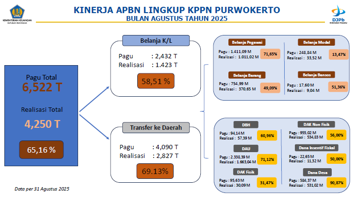 Sampai dengan 31 Agustus 2025 realisasi belanja pemerintah pusat yang disalurkan oleh Kantor Pelayanan Perbendaharaan Negara Purwokerto Purwokerto sebesar Rp 4.251.924.172.258,00 (empat triliun dua ratus lima puluh satu milyar sembilan ratus dua puluh empat juta seratus tujuh puluh dua ribu dua ratus lima puluh delapan rupiah) atau 64,66% dengan rincian sebagai berikut: