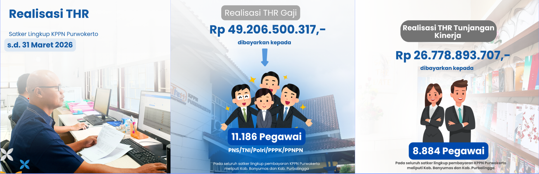 Hingga Rabu (01/04), KPPN Purwokerto telah merealisasikan penyaluran THR tahun 2026 sebesar Rp49,20 miliar kepada 11.186 aparatur sipil negara pemerintah pusat serta anggota TNI/Polri. Secara rinci, pembayaran THR berupa gaji untuk PNS/TNI/Polri mencapai Rp45,58 miliar yang diberikan kepada 9.637 pegawai. Selain itu, THR dalam bentuk tunjangan kinerja telah disalurkan kepada 8.884 pegawai dengan total nilai Rp26,77 miliar. Adapun THR untuk 1.308 PPPK terealisasi sebesar Rp2,91 miliar, sementara untuk 241 PPNPN mencapai Rp709 juta.