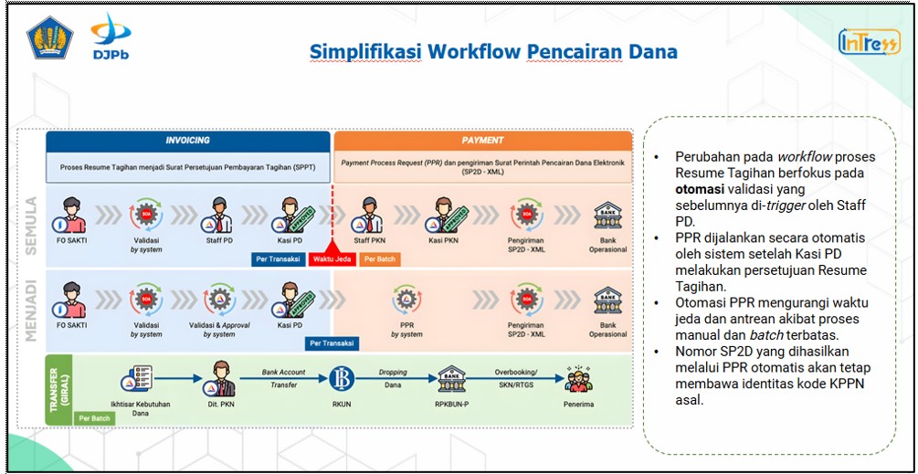 - Otomasi proses data dari SAKTI BUN (Fitur Aplikasi SAKTI yang digunakan oleh KPPN dalam melakukan pengujian dan verifikasi SPM) langsung ke Kasi PD (tanpa melalui Staf PD)