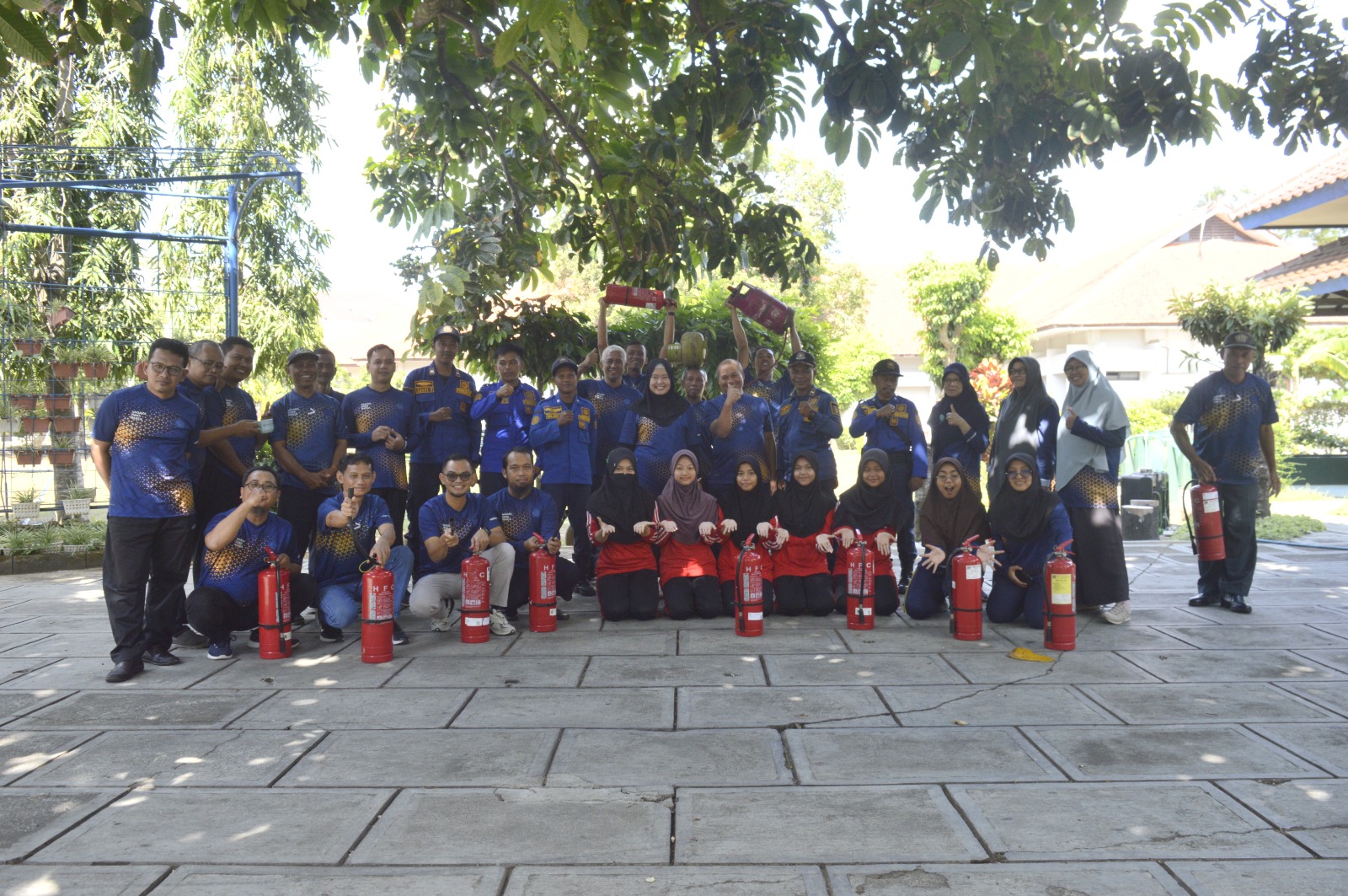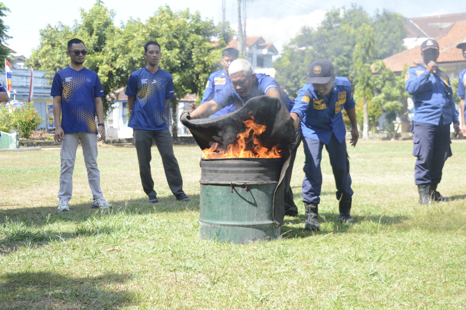 Setelah penyuluhan teori, peserta diberikan kesempatan untuk berlatih memadamkan api menggunakan berbagai alat pemadam kebakaran. Praktik ini meliputi pemeriksaan kondisi APAR, cara membuka APAR dengan benar, serta teknik menyemprotkan APAR pada sumber api dengan posisi yang tepat. Selain itu, peserta juga dilatih menggunakan karung goni basah untuk memadamkan api dan melakukan evakuasi jika terjebak dalam ruangan yang berasap, dengan cara merangkak keluar untuk menghindari paparan asap.